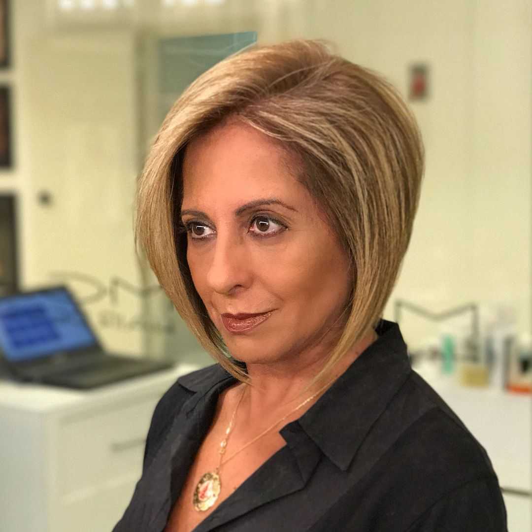 Именно удлиненный градуированный боб, дополненный скошенной или длинной челкой, уже несколько лет подряд уверенно занимает лидирующие позиции среди фаворитов стрижек для женщин в возрасте.