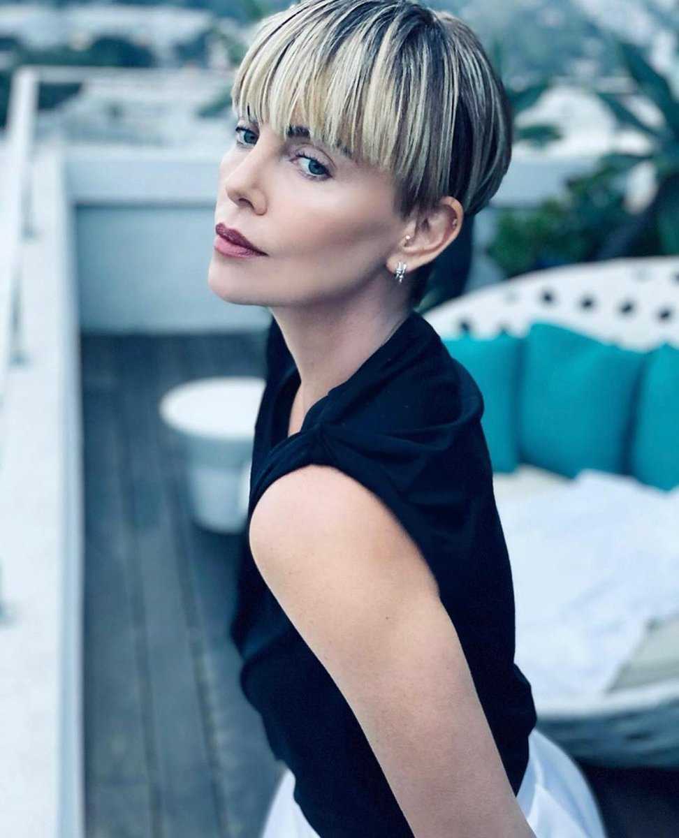 Шарлиз Терон написала в Instagram, что украсила короткую стрижку с прямой челкой одинаковой длины по всей окружности. головы.