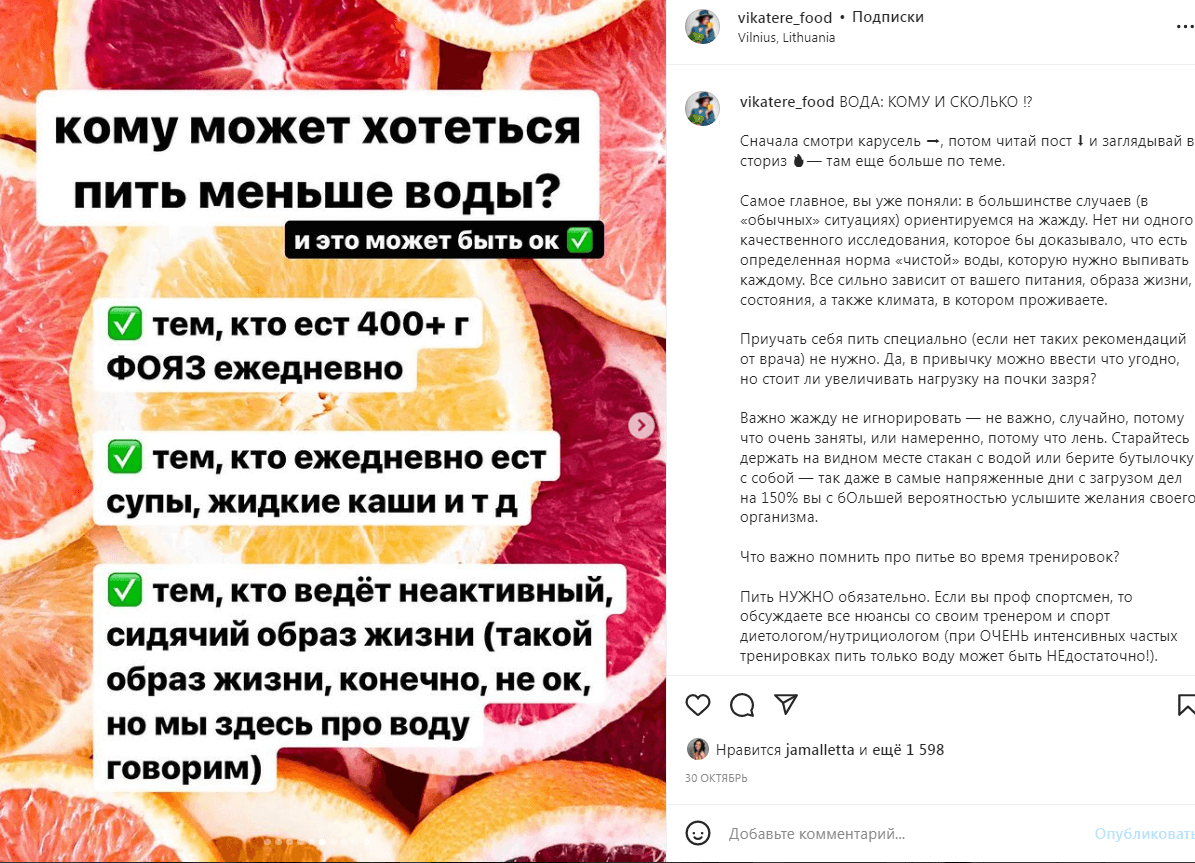 Само собой, публикации должны быть полезными и интересными, чтобы стимулировать фолловеров оставить лайк или комментарий. Но чтобы сильнее повысить вовлеченность, можно писать посты на изображении. То есть под фото публикуется подводка, а остальной текст размещается на картинке (белой, цветной, с фоном). Нажимая на новый слайд, пользователи будут взаимодействовать с профилем. А чем больше точек касания, тем лучше для продвижения.