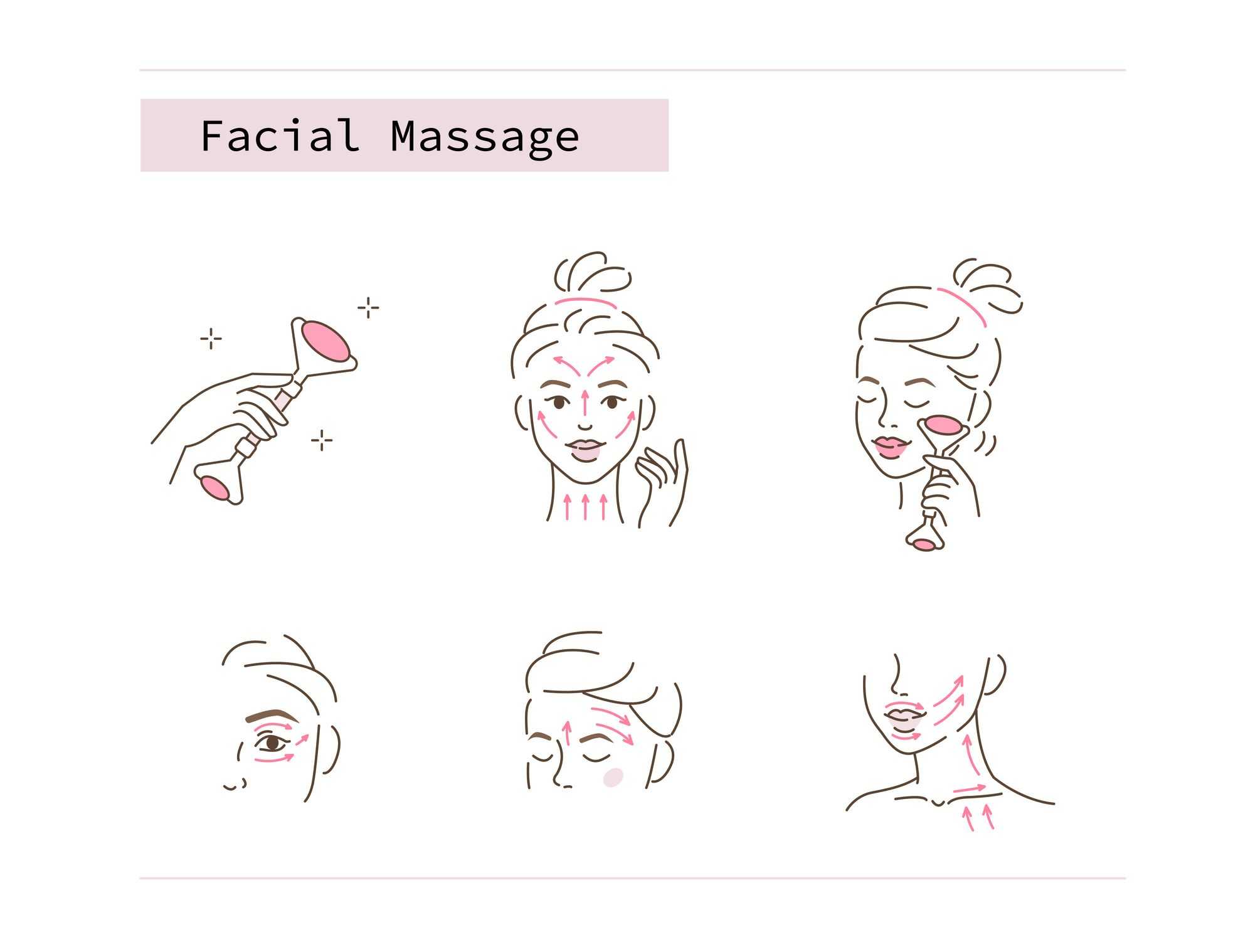 Движения всегда должны быть снизу вверх чтобы противодействовать силе тяжести, которая заставляет мышцы лица опускаться вниз. Посмотрим, как это сделать для каждой области: