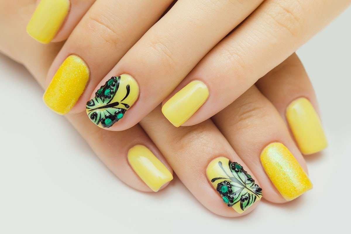 Это едва ли не самый удачный цвет для маникюра для смуглых девушек, важно только правильно выбрать его оттенок. Очень яркого желтого цвета стоит избегать, а вот цвет спелой дыни или меда будет выглядеть на загорелых руках идеально