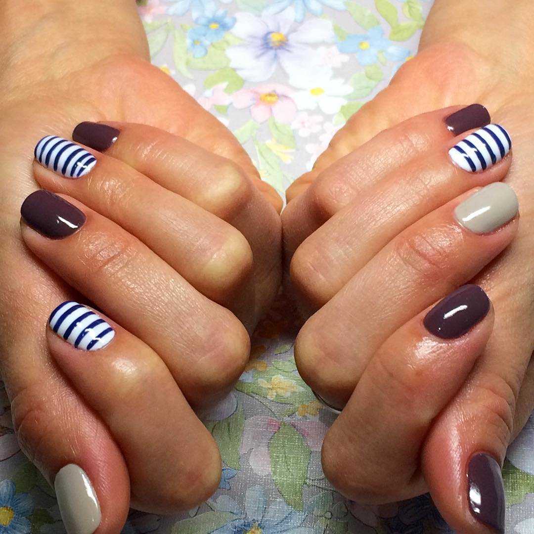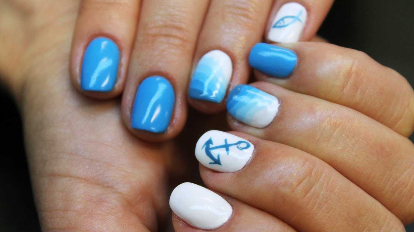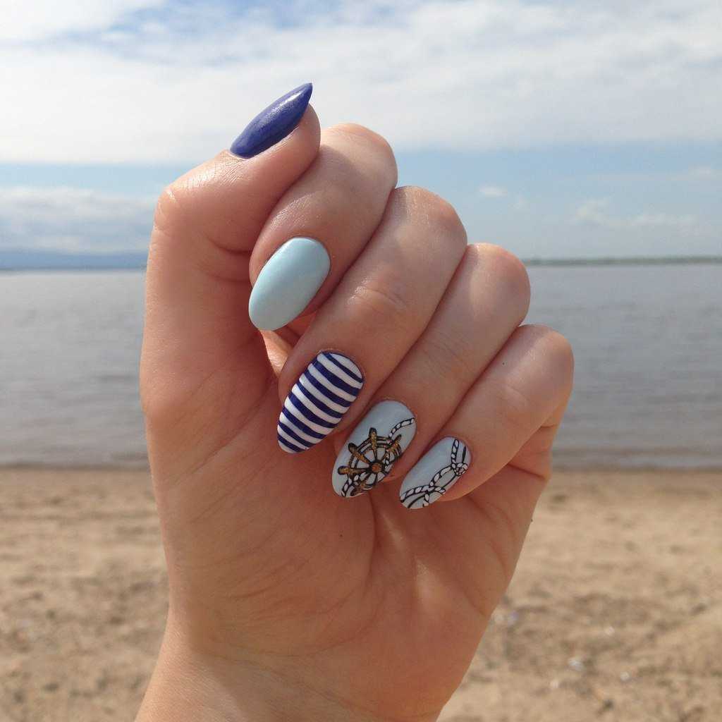 маникюр в морской тематике в летнее время пользуется особой популярностью. Для него используются лаки белого и красного цветов, а также всевозможных оттенков синего. Они хорошо сочетаются между собой и гармонируют с загорелой кожей. Вариантов оформления ногтей несколько, это могут быть и однотонные ногти, и рисунок с полосочками вдоль или поперек ногтевой пластины. Неплохо выглядит рисунок в виде якоря, ракушки или морской звезды на одном из ногтей;
