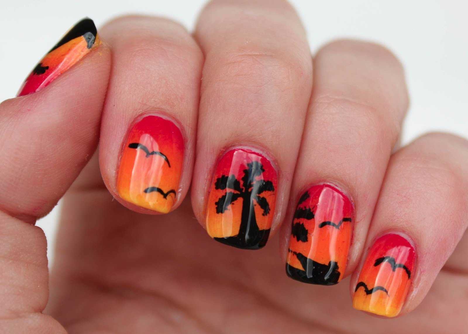 Пальмовый принт. Очень красиво и соблазнительно смотрится нейл-арт, заставляющий вспомнить, насколько великолепен закат на берегу моря. Для воссоздания картинки нужно использовать оранжевые и бежевые оттенки для имитации песка, черные и красные – для изображения заката и зеленые для пальм. Если вы неуверены, что можете правильно выполнить рисунок пальмы, воспользуйтесь специальными наклейками.