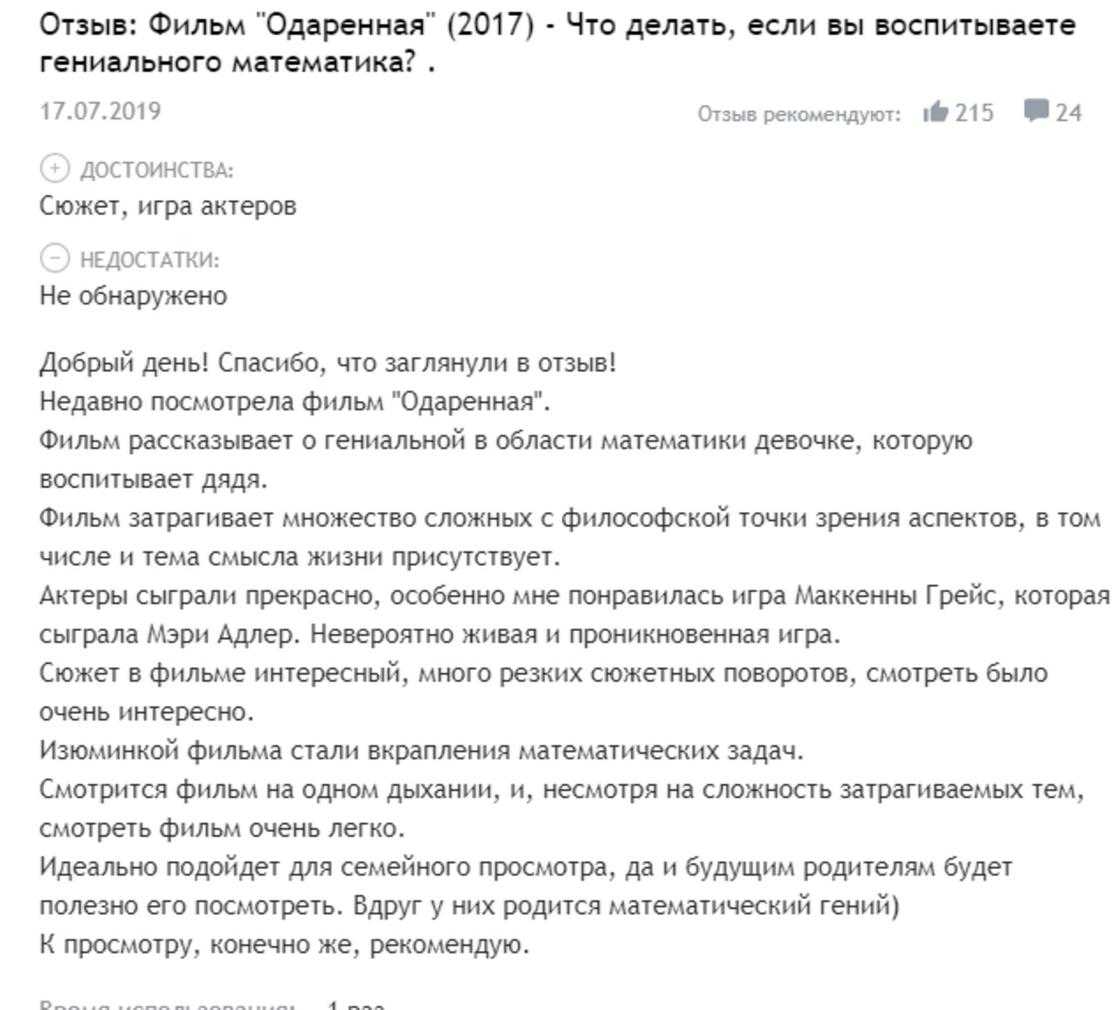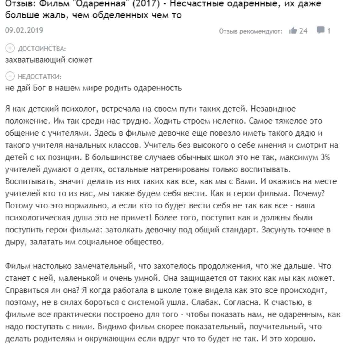 После премьеры в 2017 году поклонники психологических драм получили возможность фильм «Одаренная» смотреть онлайн бесплатно в хорошем качестве. Зрительские комментарии и отзывы позволяют составить мнение о достоинствах и проигрышных моментах этого фильма. Предлагаем познакомиться с самыми содержательными описаниями фильма: