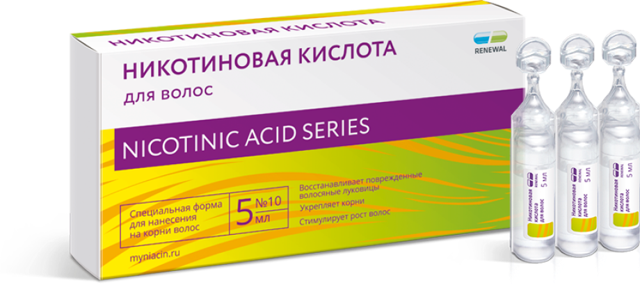 - Никотиновая кислота. Несмываемое средство, которое стимулирует рост волос за счет пробуждения спящих луковиц и активизации их роста. Преимущество никотиновой кислоты заключается в ее эффективности, доступности (ее можно приобрести в стандартных аптеках и любых онлайн аптечных магазинах), а также невысокой цене. Если стоимость курса применения несмываемых масел колеблется от 1000 до 1500 руб., то курс никотиновой кислоты обойдется в 500–600 руб.