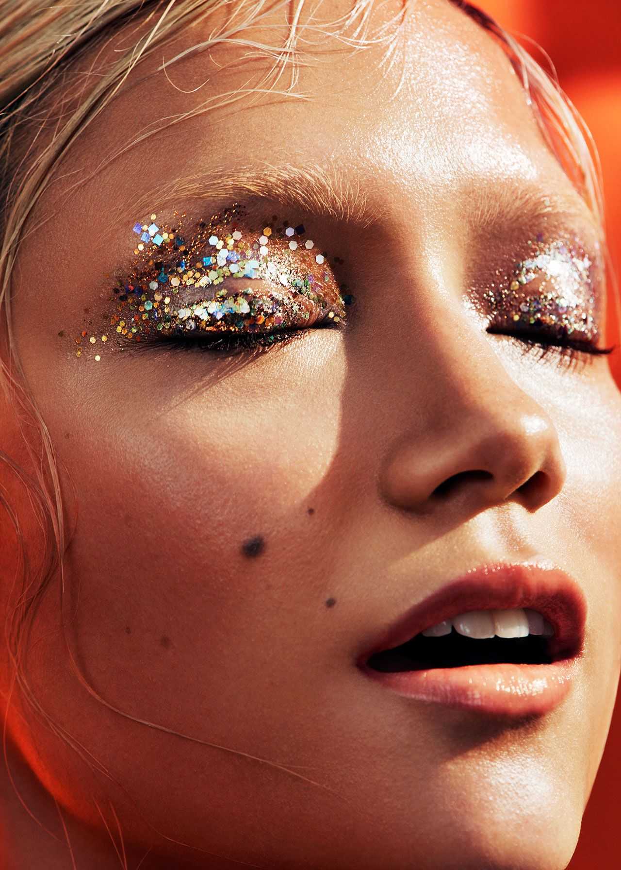Смело используйте продукты с мерцающими частичками в макияже глаз и губ.