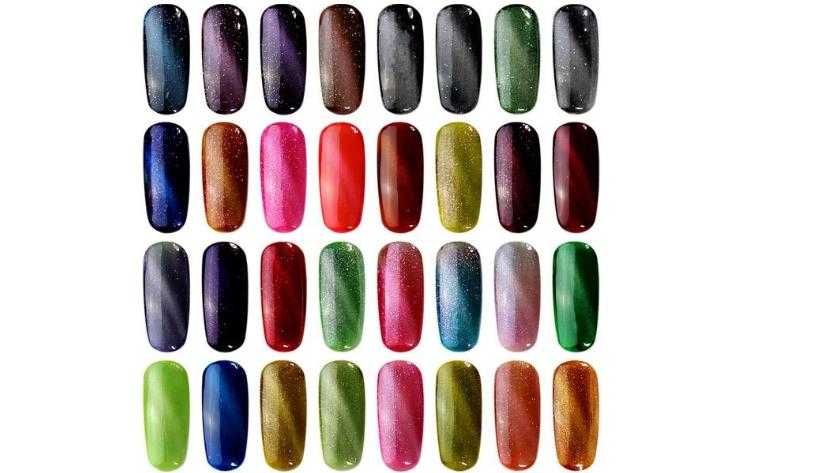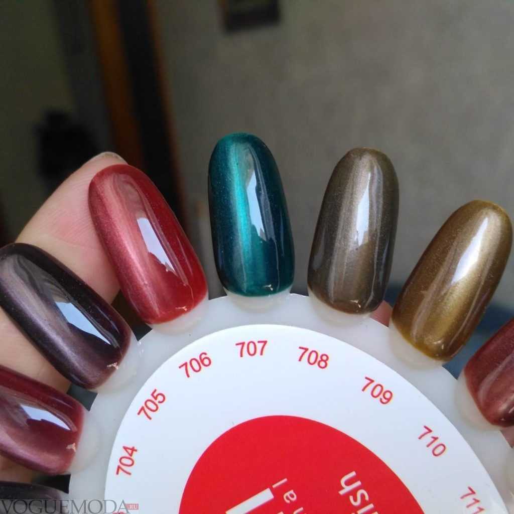 Маникюр «Кошачий глаз» гель-лаками можно создать в любой цветовой гамме. На фотографии ниже рассмотрите варианты цветов и как лак будет выглядеть на ногтях. Даже однотонное покрытие ногтей данным лаком смотрится невероятно эффектно, особенно красиво переливаются блики на солнце или при свете электрических ламп.