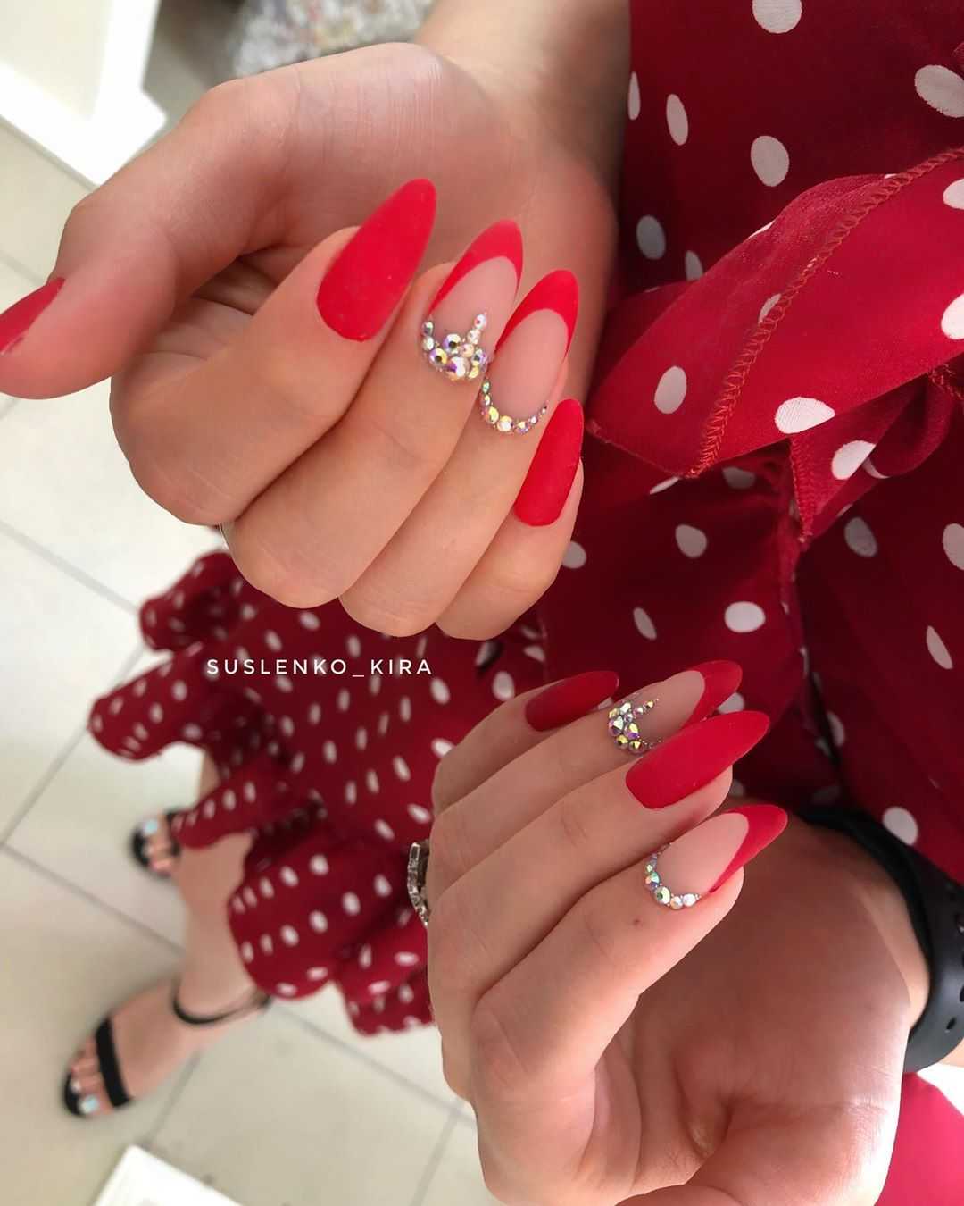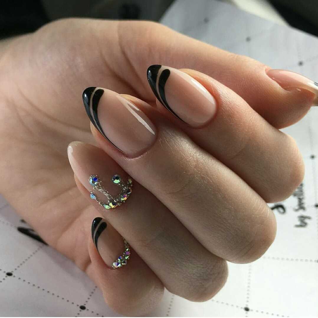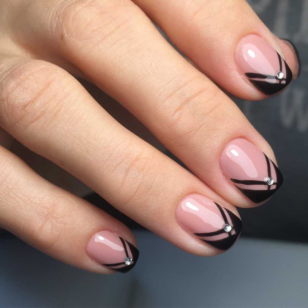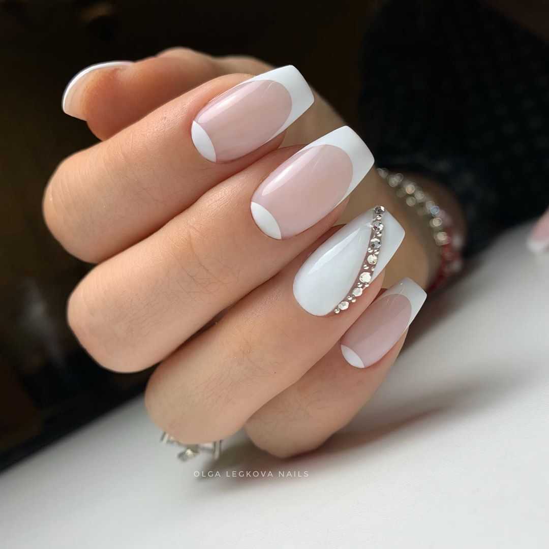 А вот несколько фото френча с использованием камней. Выглядит такой маникюр с дизайном изысканно. Подбираются камни разной формы и размеров. Задача мастера умело расположить их.