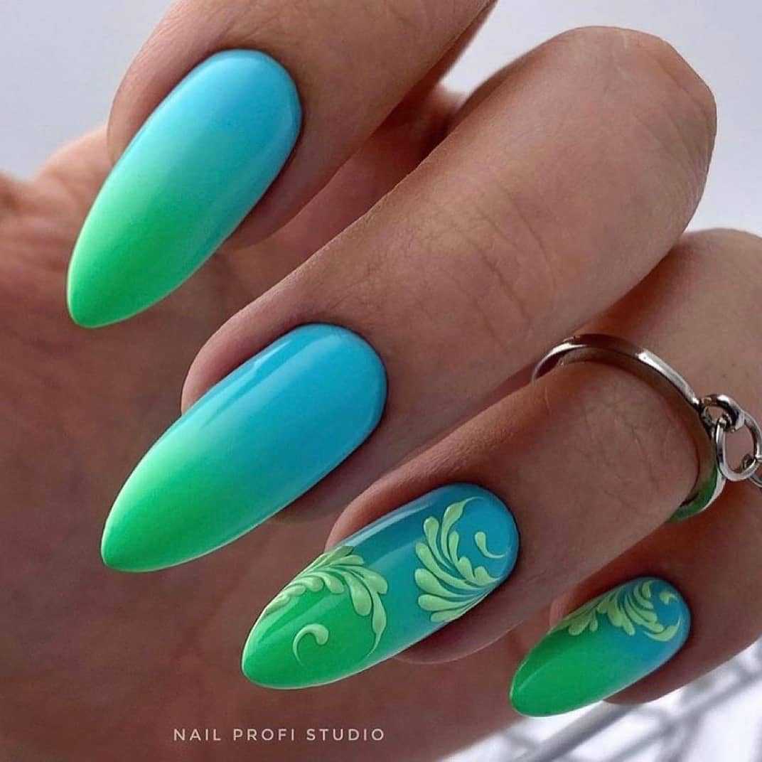 Яркий и чистый цвет особенно эффектен в комбинации с матовым топом. Но если хочется глянца, стоит рассмотреть градиентное оформление, максимально раскрывающее это великолепный тон лака.