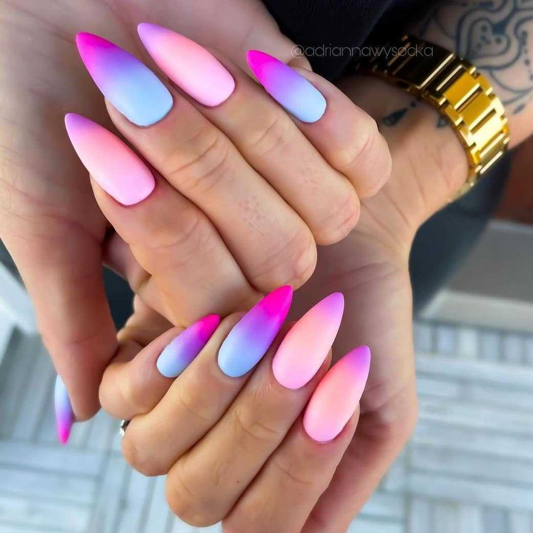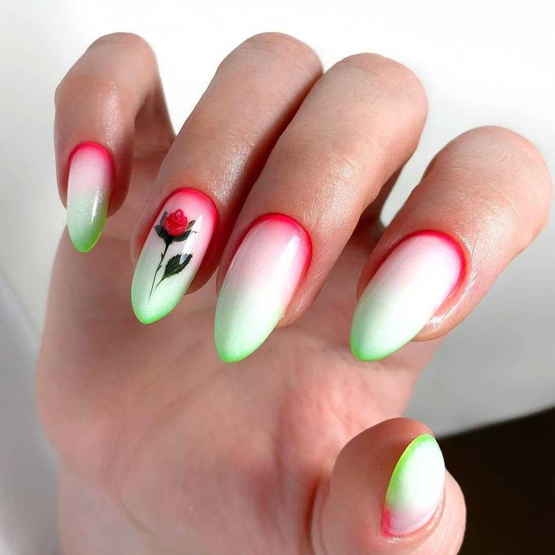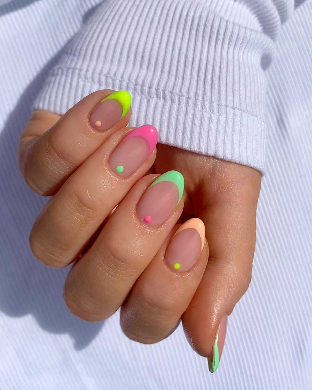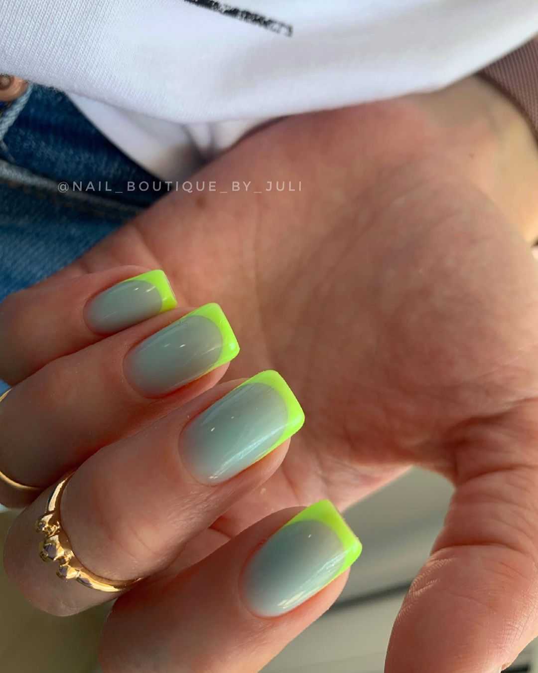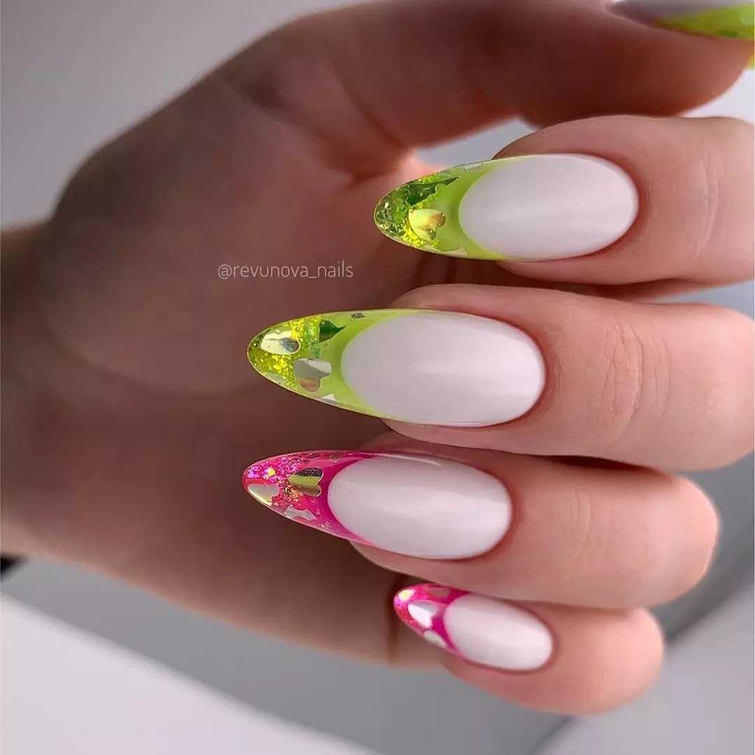 В летние месяцы девушкам хочется легких образов и ярких красок. Сезон с июня по август в 2023 году станет исключение для отказа от разноцветных гель-лаков. В создании френча можно использовать даже кислотные цвета. К наиболее стильным вариантам сочетания относятся: