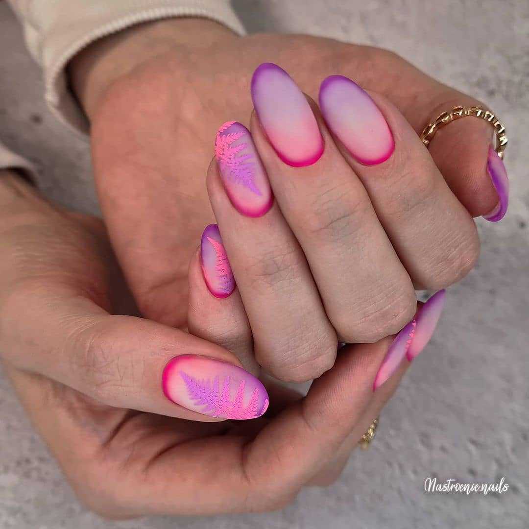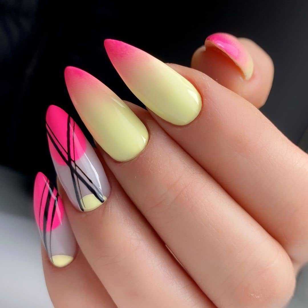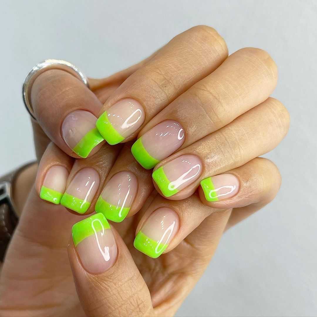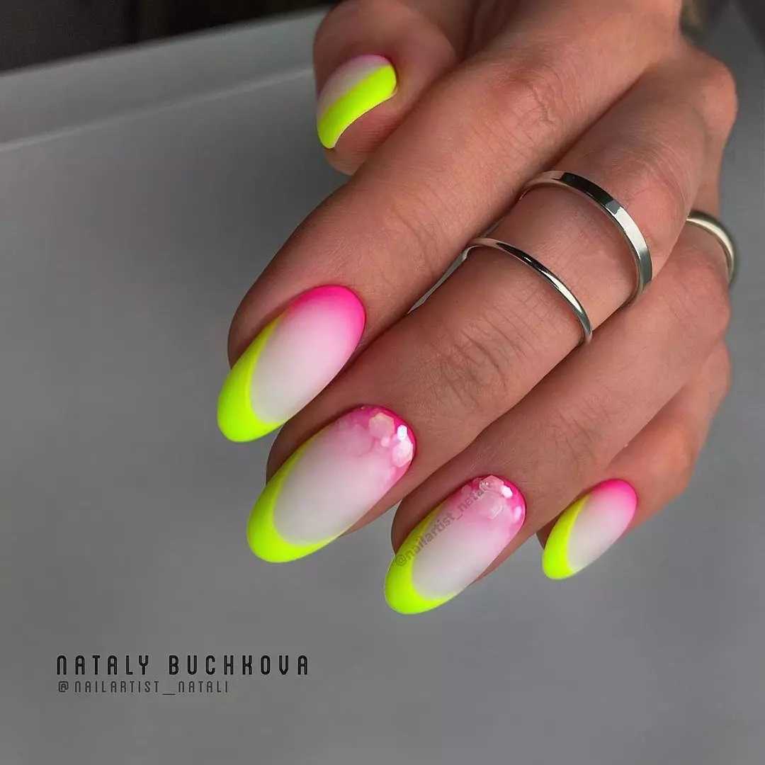 Неоновые особо популярны среди молодых девушек. Эффектно выглядит с окантовкой ярко-салатовой, розовой, желтой на нюдовой базе. Красиво смотрится на смуглой коже рук. Поэтому чаще используют его для отдыха в летний период.