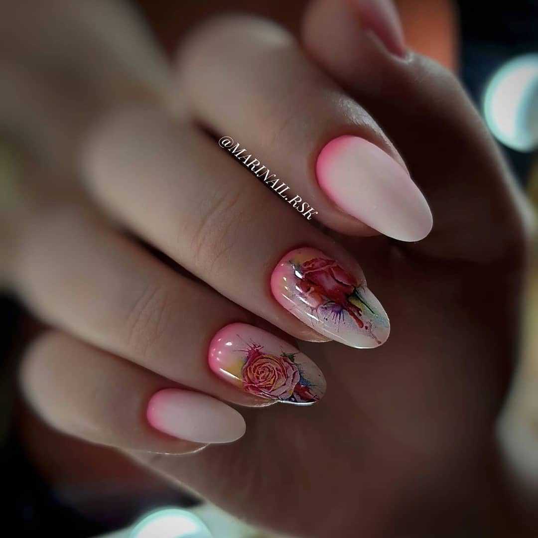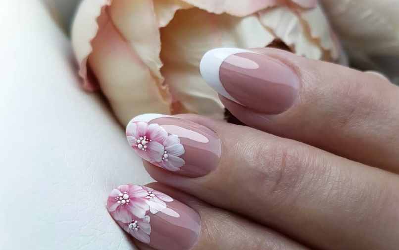 Цветочная тема в этом году популярна. Используют готовые наклейки с изображением цветов, которые располагают на ногтевых пластинах нескольких пальцев. Мастера также самостоятельно прорисовывают рисунок. Наносят специальной кистью. В качестве декораций применяют стразы, камни, блестки.