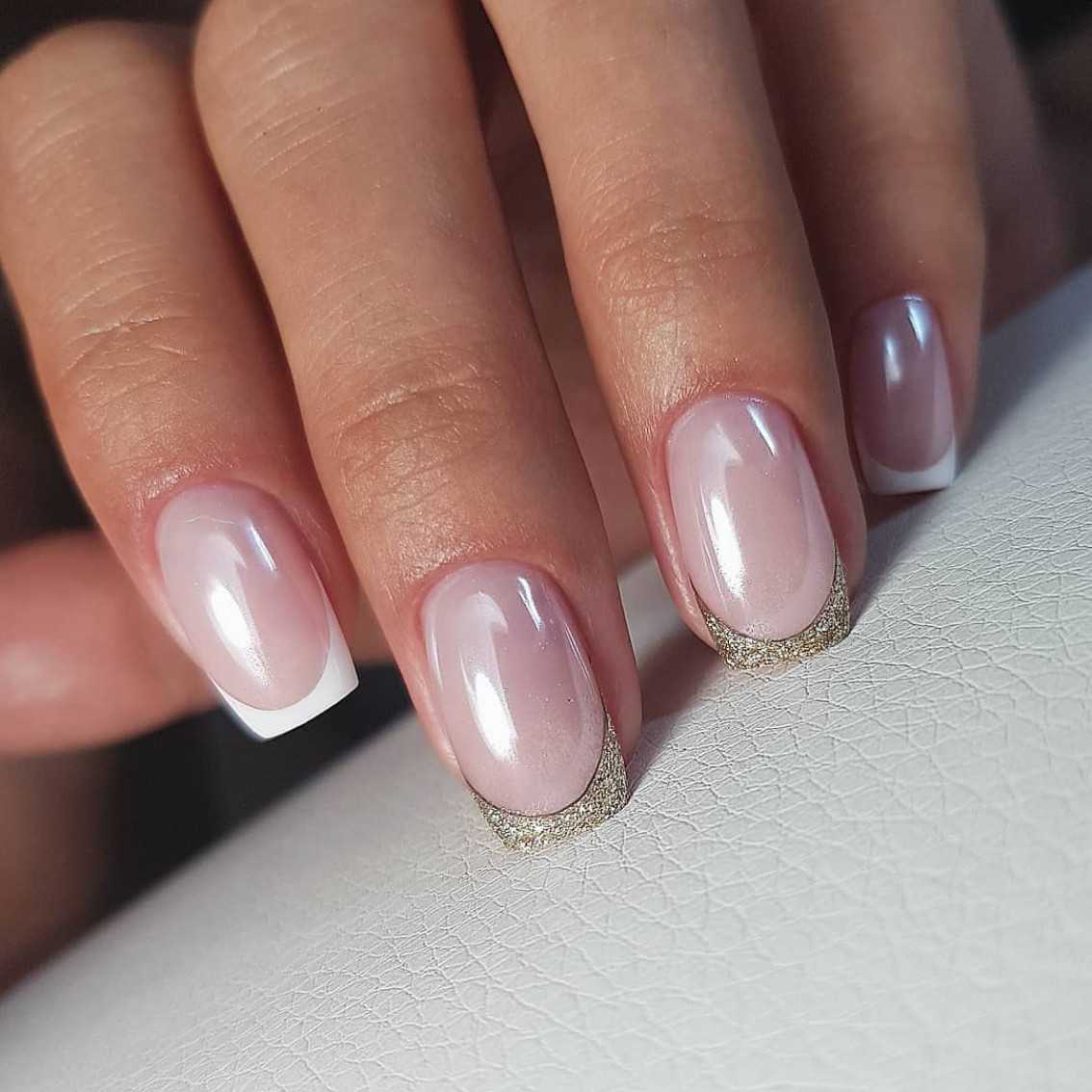 - френч с блестками — сияющие частицы можно заложить в основу или в финишное покрытие.