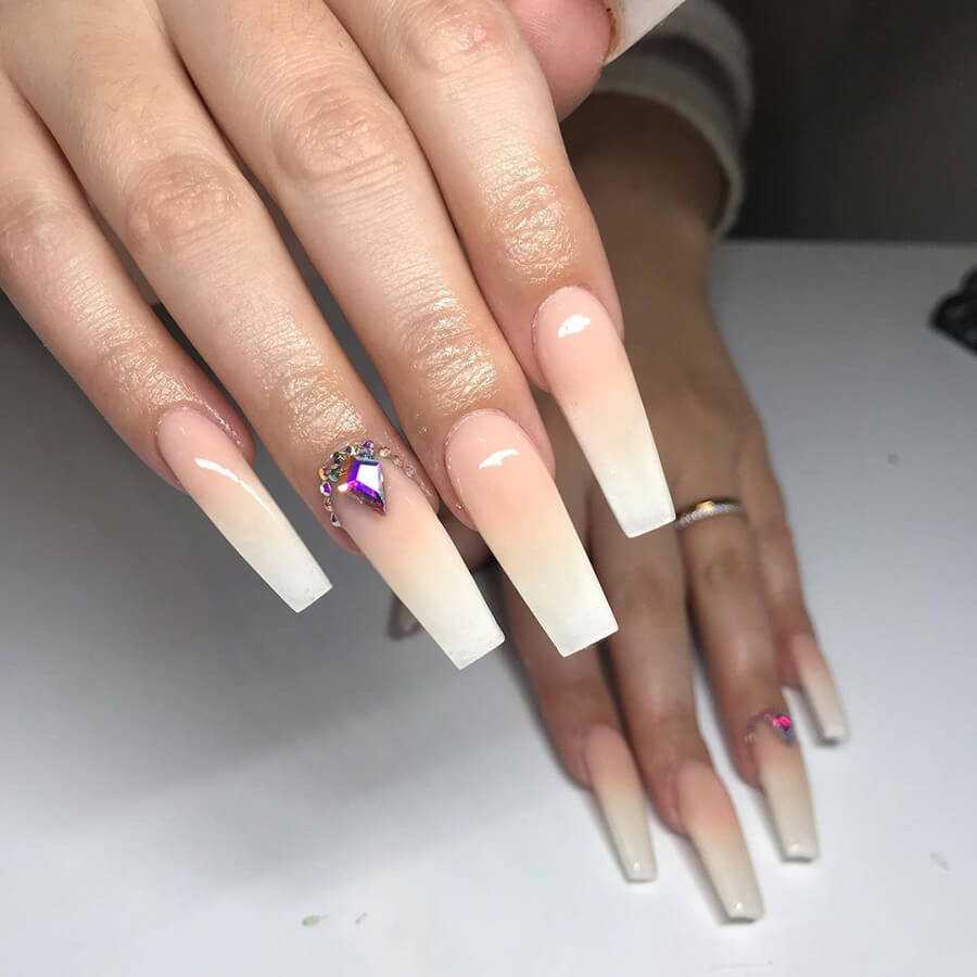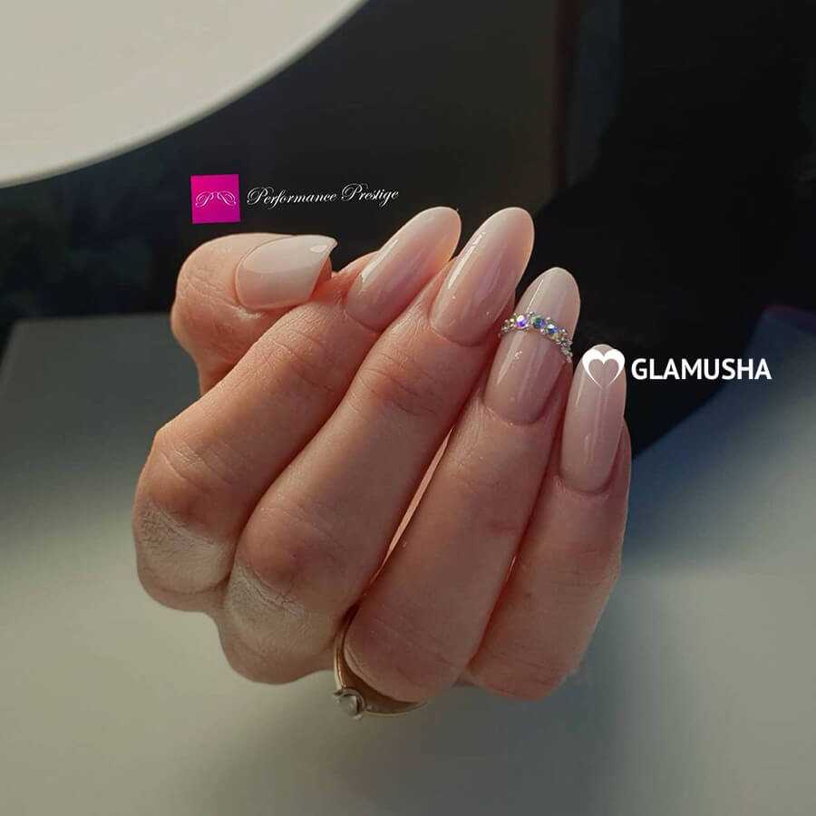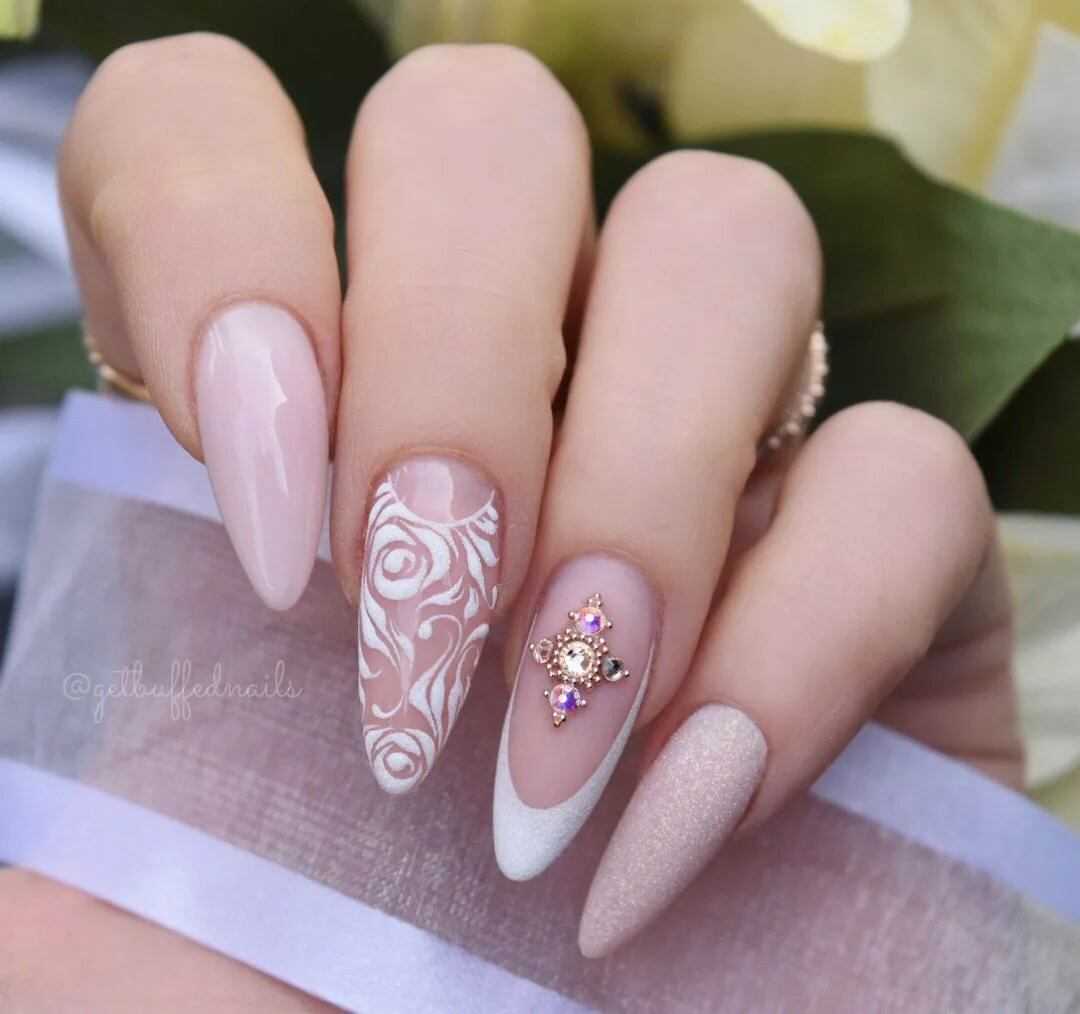 Мы уже писали, что нюд на длинных ногтях подразумевает множество вариантов нейл-арта. Стразы — это один из таких вариантов. С нюдовыми оттенками стразы смотрятся особо элегантно и при этом совсем нет вычурности.