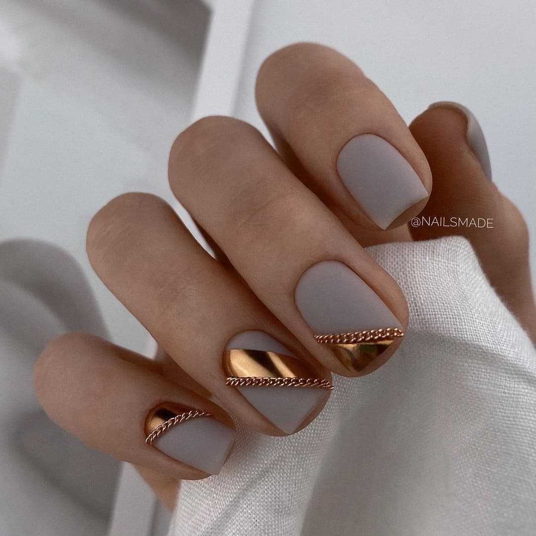 Оригинально будет смотреться маникюр, если на короткие ногти нанести металлические оттенки, например, это может быть золотое, медное, серебряной покрытие или любая иная металлизированная поверхность.