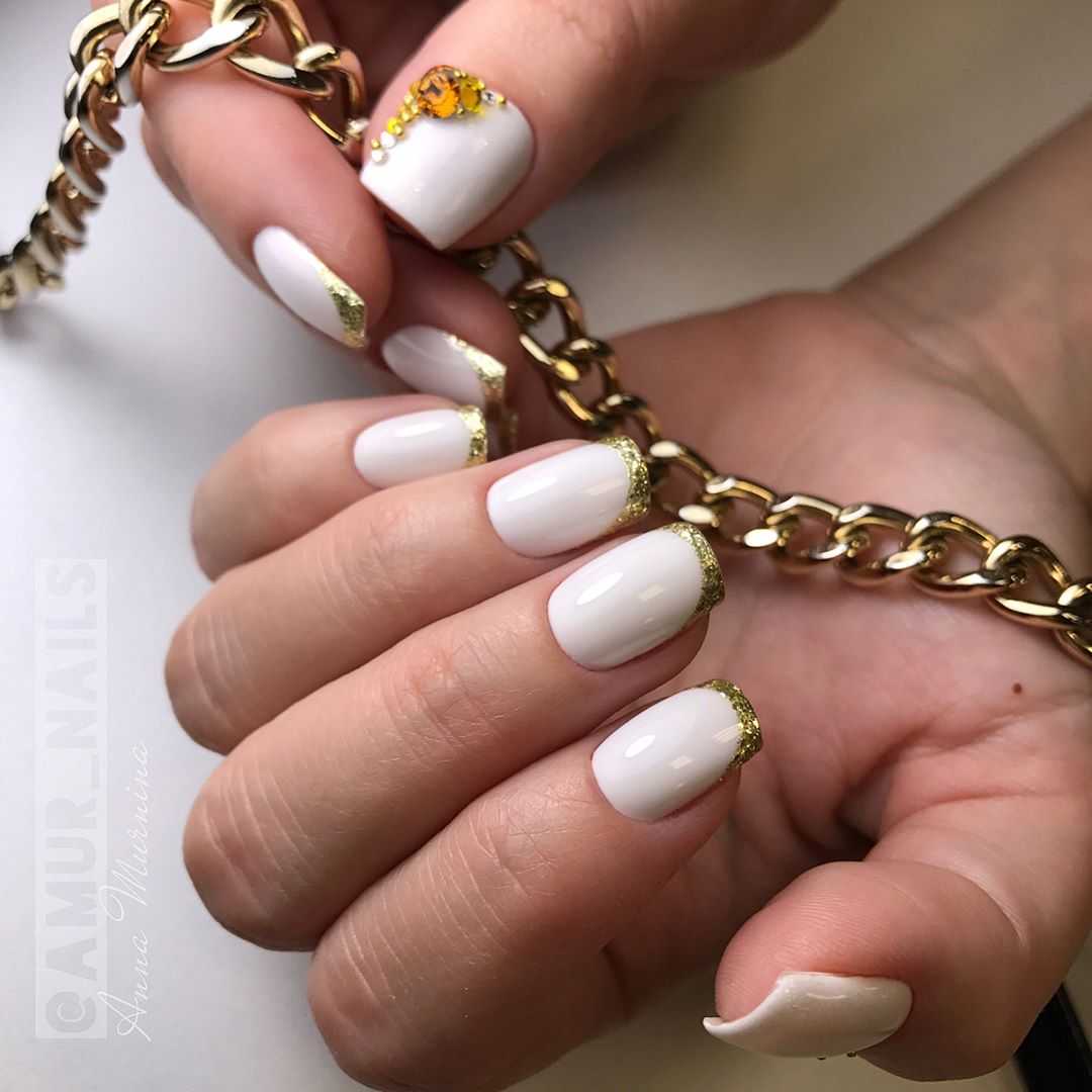 А если есть желание выделиться по полной, то добавьте к белому маникюру стразы, наклейки, глиттер или лепку.