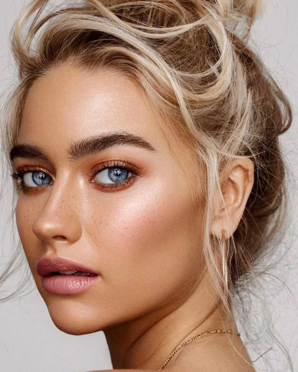 Кареглазые барышни на Новый год не обойдутся без бронзового цвета и любых ее оттенков. Под такой цвет обязательно делать эффект «светящейся кожи», используя хайлайтер и праймер.