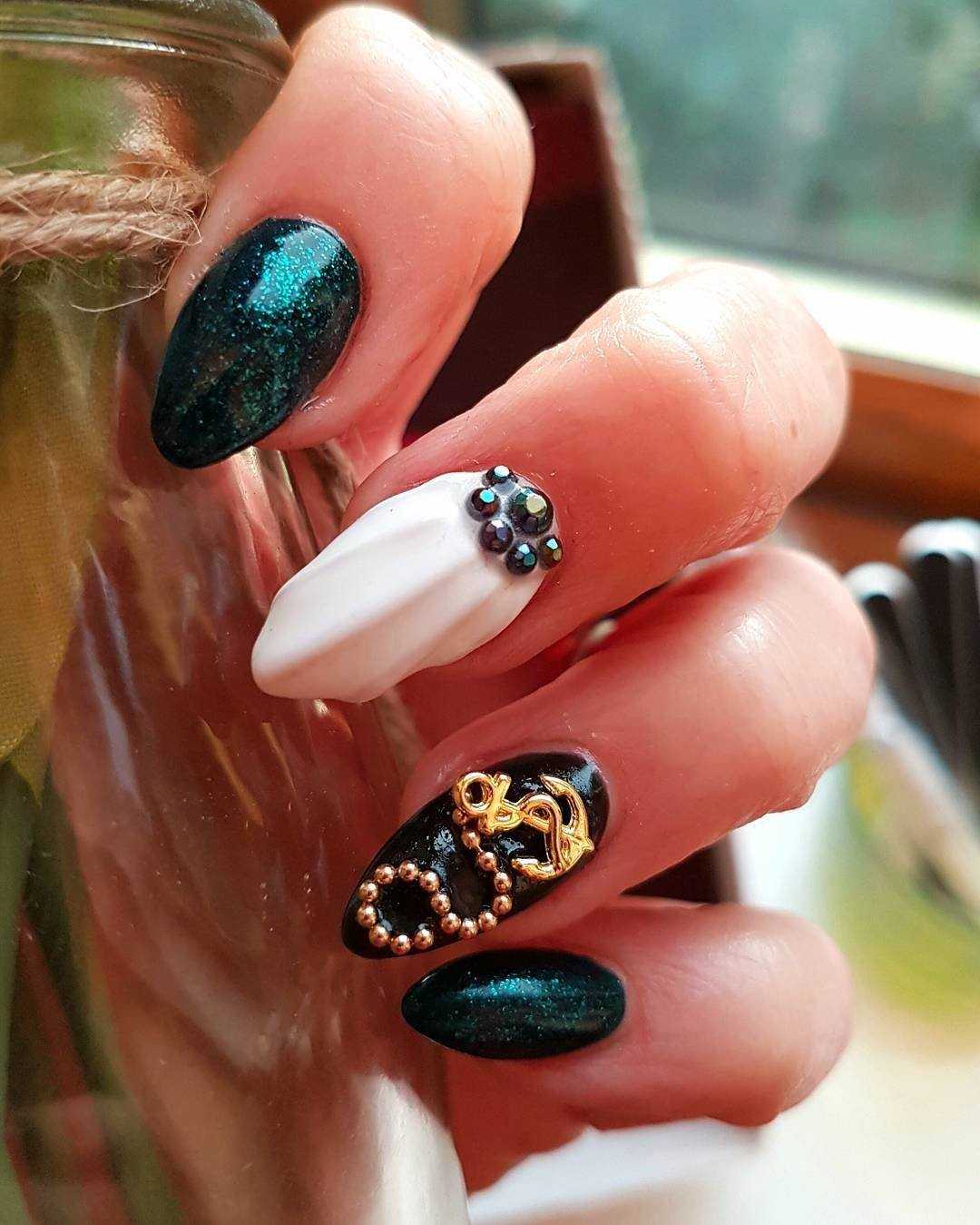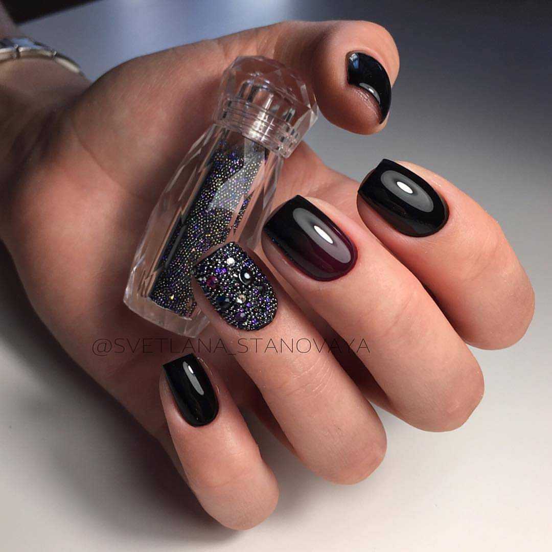 Удивительно, но именно ультрамарин вытаскивает любую форму, длину и декор ногтей. Следует оставить в стороне стразы и блески, выбрав сочетание с другими цветами и рисунками. Хороший вариант дизайна: полностью чёрные ногти с проблеском ультрамарина по центру.