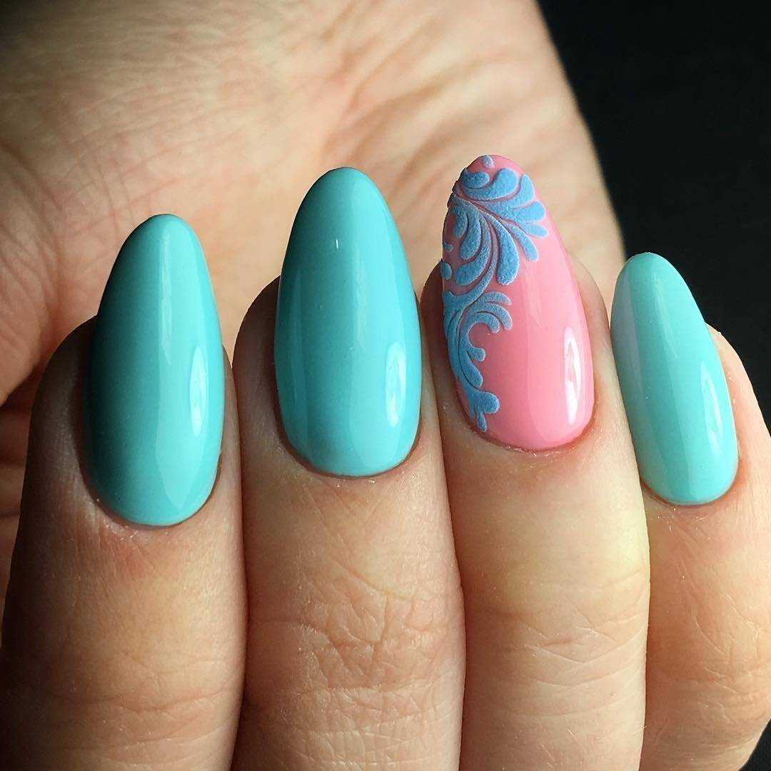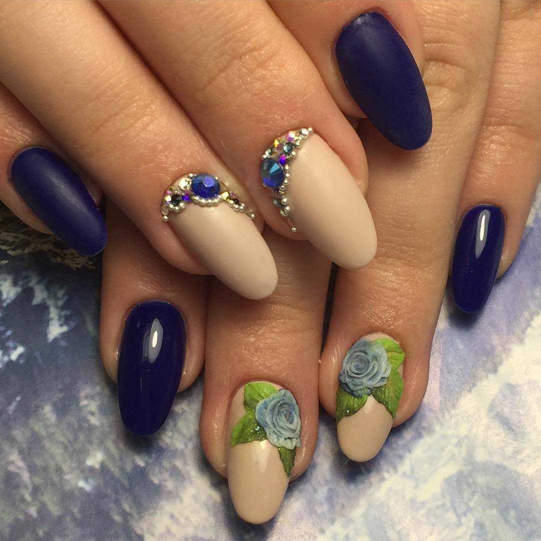 Длинные «вытащат» любую форму и дизайна синего маникюра, поскольку буквально много места. Так же будут смотреться трендовые однотонные ногти. Хорошо гармонирует геометрия, «зимний» и «космический» рисунки, стразы, пайетки.
