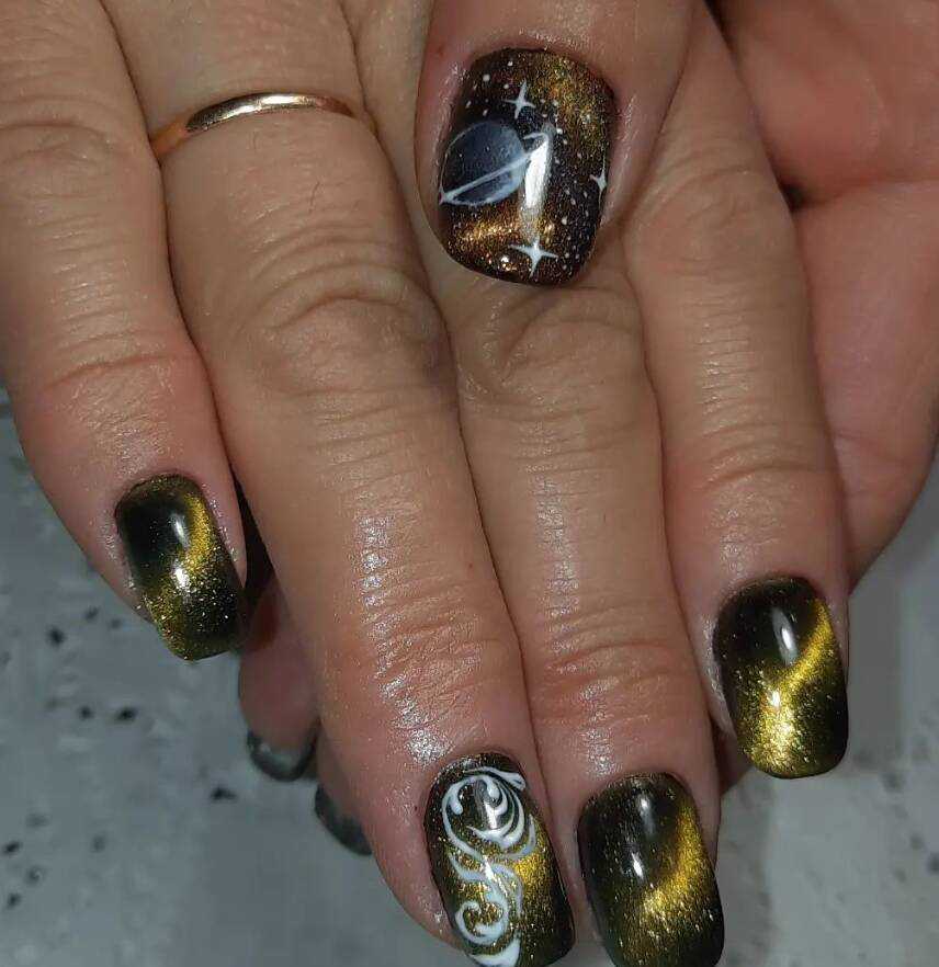 Глубокий синий всегда напоминает о космосе. Для маникюра лучше всего выбрать серебристые тона. Здесь подойдет поталь, которая добавит эффект литья. Хорошо смотрятся однотонные ноготки в глянце.