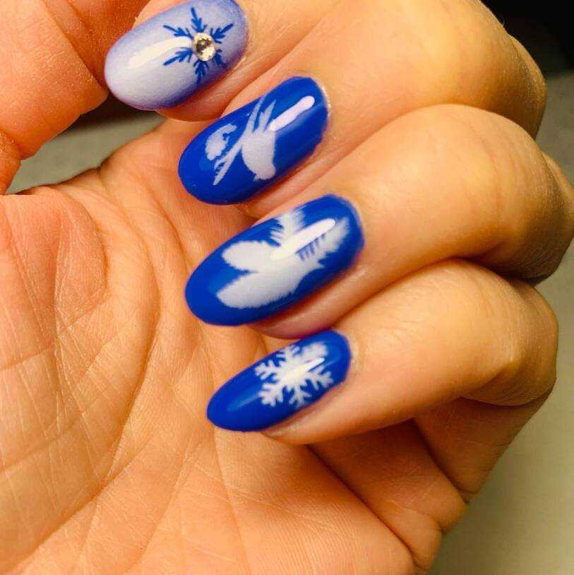 Дисбаланс дизайна может возникнут именно из-за прохладного оттенка. Его предпочтительно пускать под матовое покрытие на однотонных ногтях. Для холодного синего маникюра хорошо подойдет рисунок в виде вьюги, снежинок или просто разводов светлым лаком (белым, молочным).