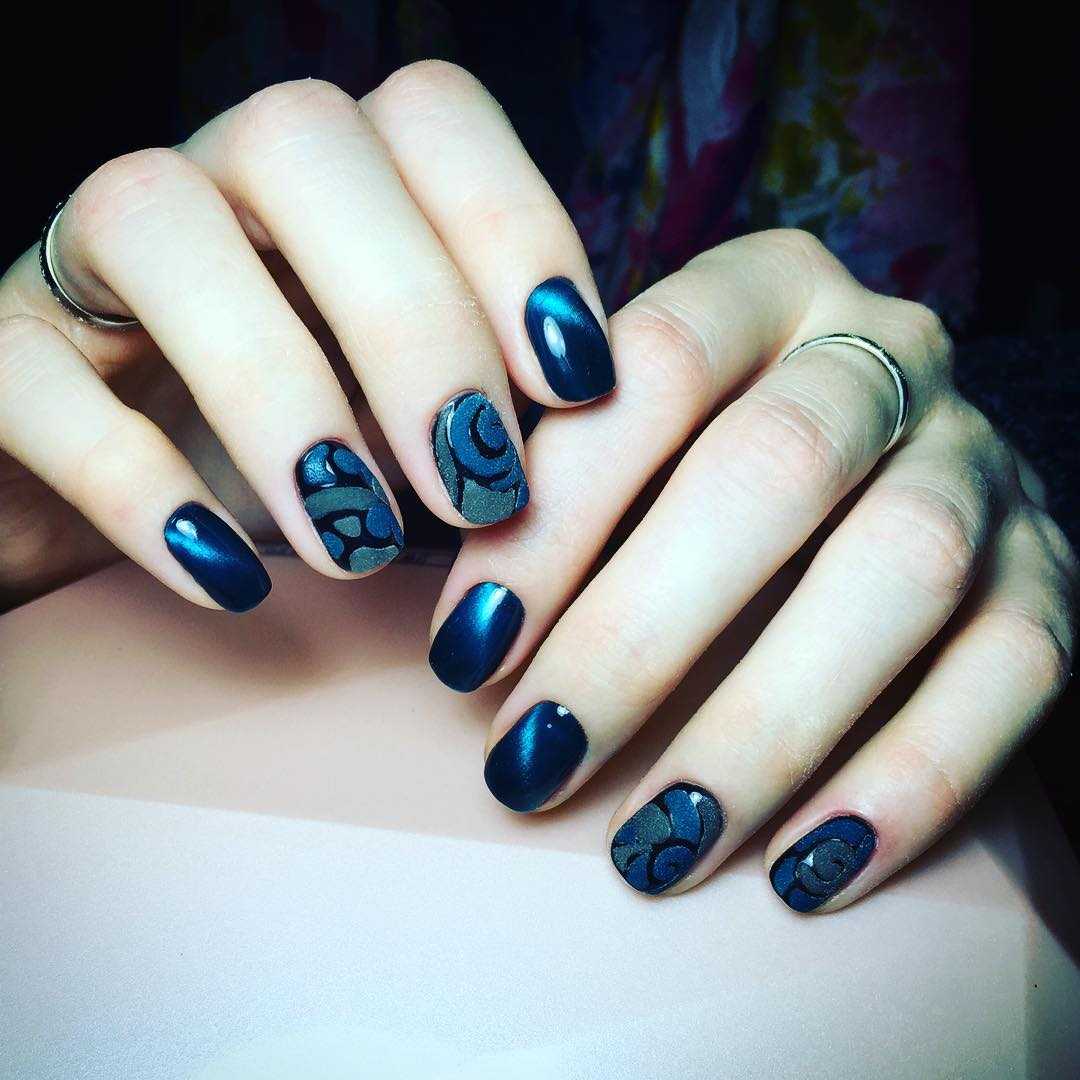 Пыльный оттенок практически отсылается к приглушенному серому. В грязно – синий маникюр не добавить блеска глянца, чтобы оттенить. Пыльно-синие ногти лучше держать под матовым покрытием, и выбирать минимализм: небольшие акцентные рисунки на отдельных пальцах.