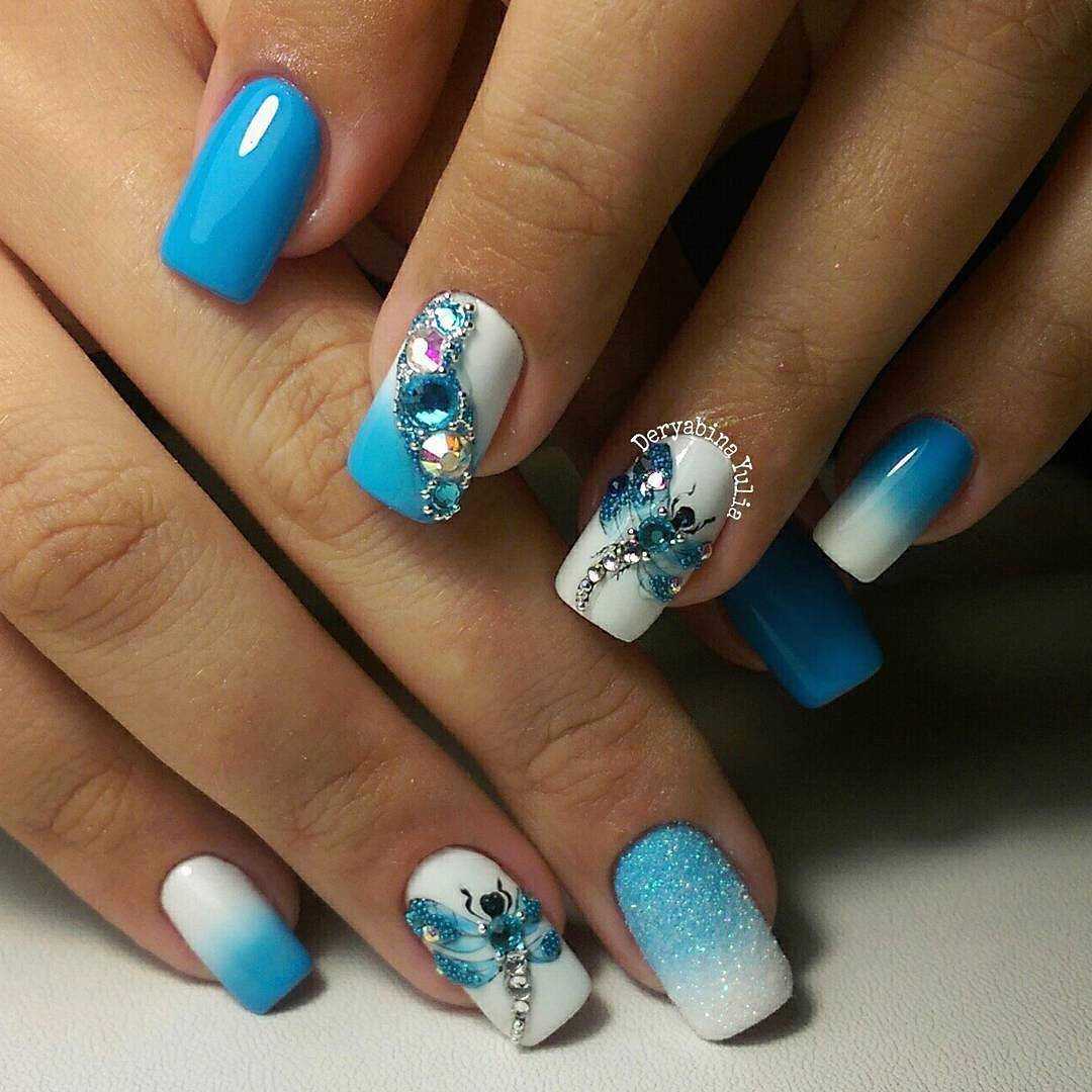 На коротких чуть сложнее воплотить яркие задумки, поскольку «рабочая среда» слишком мала. Даже градиент может выглядеть кучно. Поэтому, мастера чаще выбирают однотонный синий маникюр с дизайном в виде страз, либо фольгой. Так же френч, лунный или «кошачий глаз».