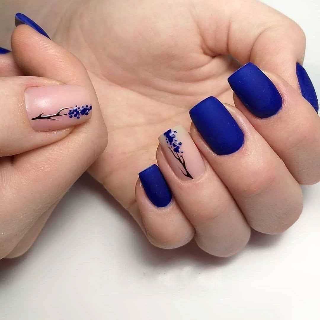 Еще одна красивая идея – покрыть все ногти одним цветом, а безымянный оставить прозрачным и нанести на него рисунок цветка или веточки. Наиболее актуальными оттенками являются синий, кофейный, оливковый и красный.