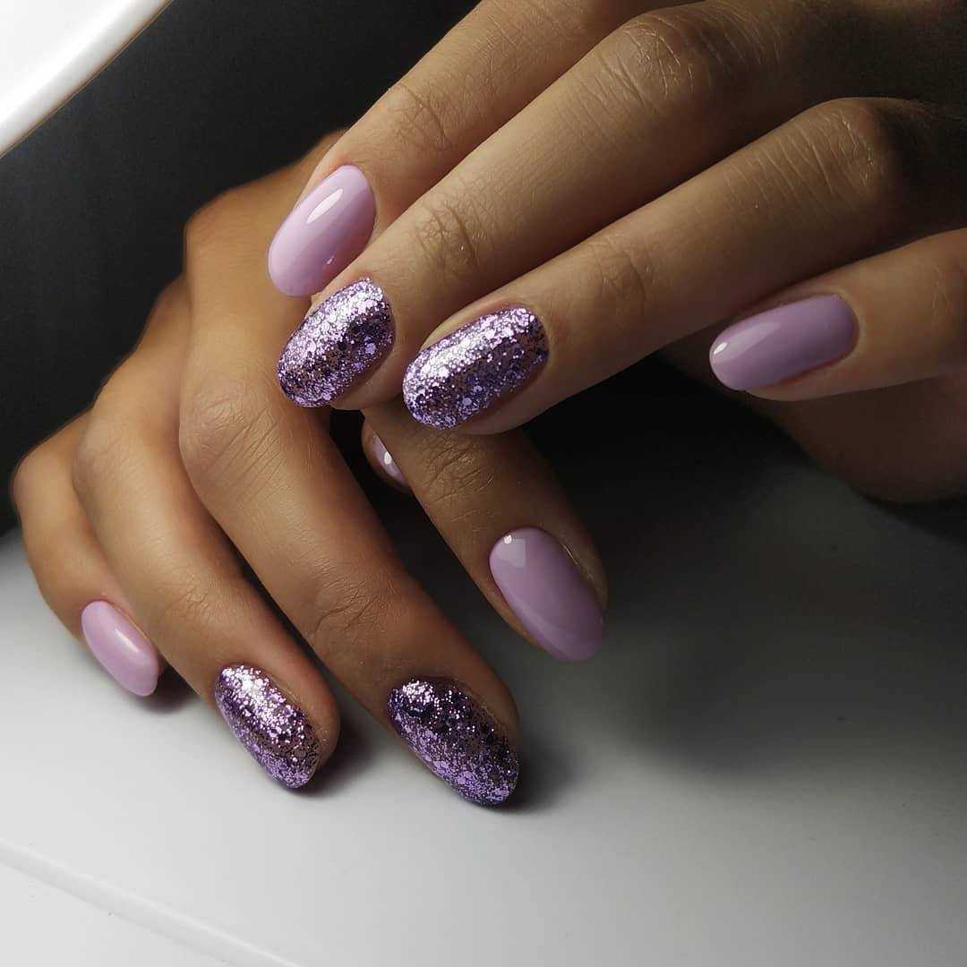 - однотонное покрытие ногтей фиолетовым гель-лаком и серебряным глиттером – глиттер чаще всего располагается на безымянном пальце