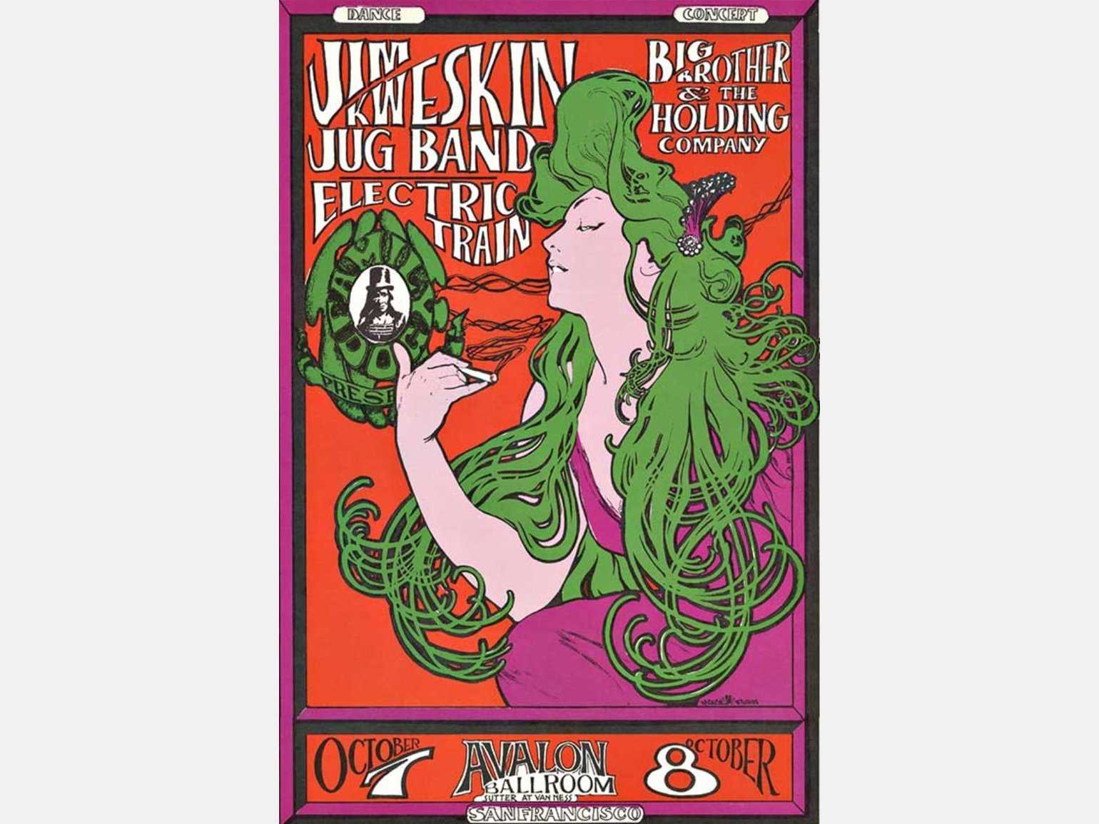 Музыканты, конкурируя за внимание слушателя, используют эксцентричные формы, шрифты, узоры, женские образы. Психоделическая культура хиппи переосмысляет модерн ― главное отличие нового «модерна» от образцов прошлого в использовании насыщенных, контрастных цветов и образов, соответствующих духу нового времени