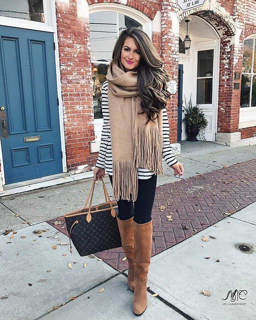 высокие сапоги на тонком каблуке, оранжевый свитер с коротким рукавом, шейный платок, джинсы и сумка