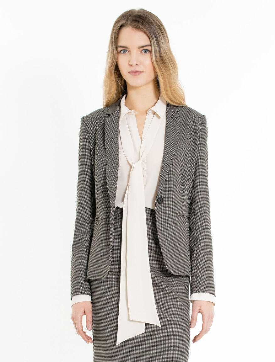 - Пиджак темного оттенка из плотной ткани, сидящий по фигуре.
