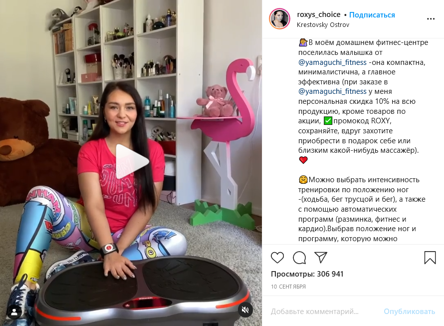 Пример как раз из бьюти-сферы: инфлюенсер обозревает спортивный тренажер для дома. Видео с тренировки, рассказ о функциях, промокод на скидку — такие посты могут приносить прямые продажи.