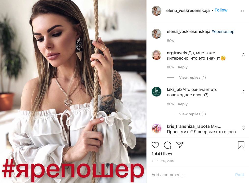 Забавный спецпроект придумала команда приложения для продажи подержанных брендовых вещей Reposh к его запуску. Через блогеров ребята запустили флешмоб с хештегом #ярепошер — блогеры публиковали пост с одним лишь хештегом без объяснений.