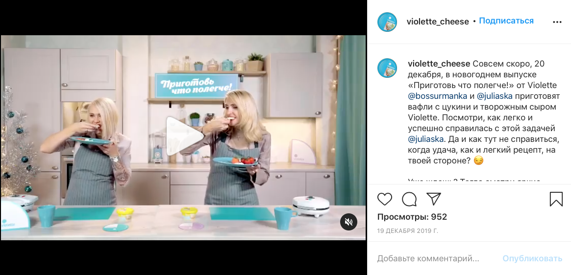 Приглашайте инфлюенсеров в аккаунт бренда. Можно выпускать брендовые видео с их участием, вести прямые эфиры, делать текстовые посты с фото. Пример от аккаунта, который продвигает творожный сыр — компания придумала кулинарное шоу и приглашает в него блогеров в качестве ведущих: