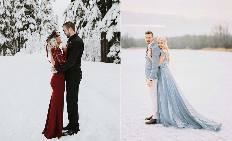На фоне белого снега любое платье будет смотреться выигрышно. Но если поверх наряда будет потертая коричневая дубленка, а стильный костюм жениха будет спрятан под серым пуховиком, фотосессия будет безжалостно загублена. Продумайте заранее цветовую гамму ваших образов.