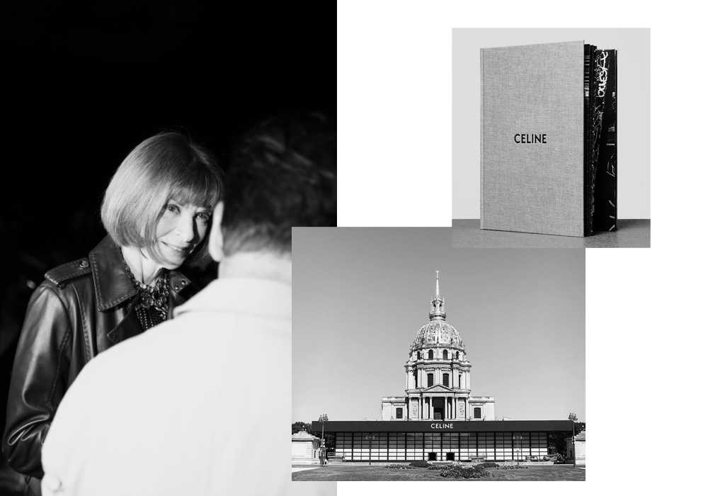 Анна Винтур на показе CELINE, пригласительный в виде книги с постерами, специально построенный подиум