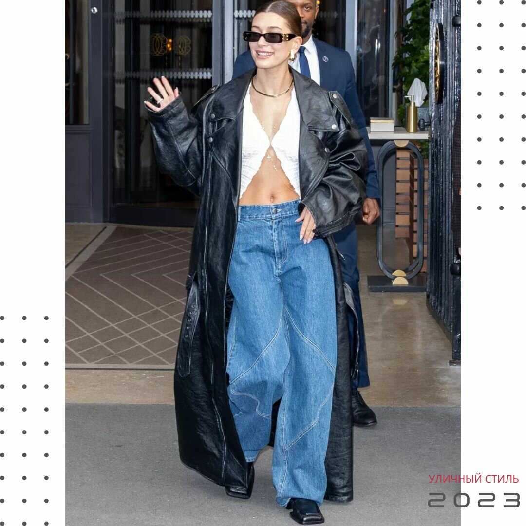 В марте 2022 года Бибер применил похожий прием, выбрав в качестве пары к мешковатым джинсам с низкой посадкой и белому, оголяющему живот топу-бабочке кожаное пальто в пол в стиле оверсайз. Этот строгий фасон придает мужественный контраст женственному ансамблю модели, а в завершение она дополнила его изящной золотой цепочкой и соответствующими украшениями.
