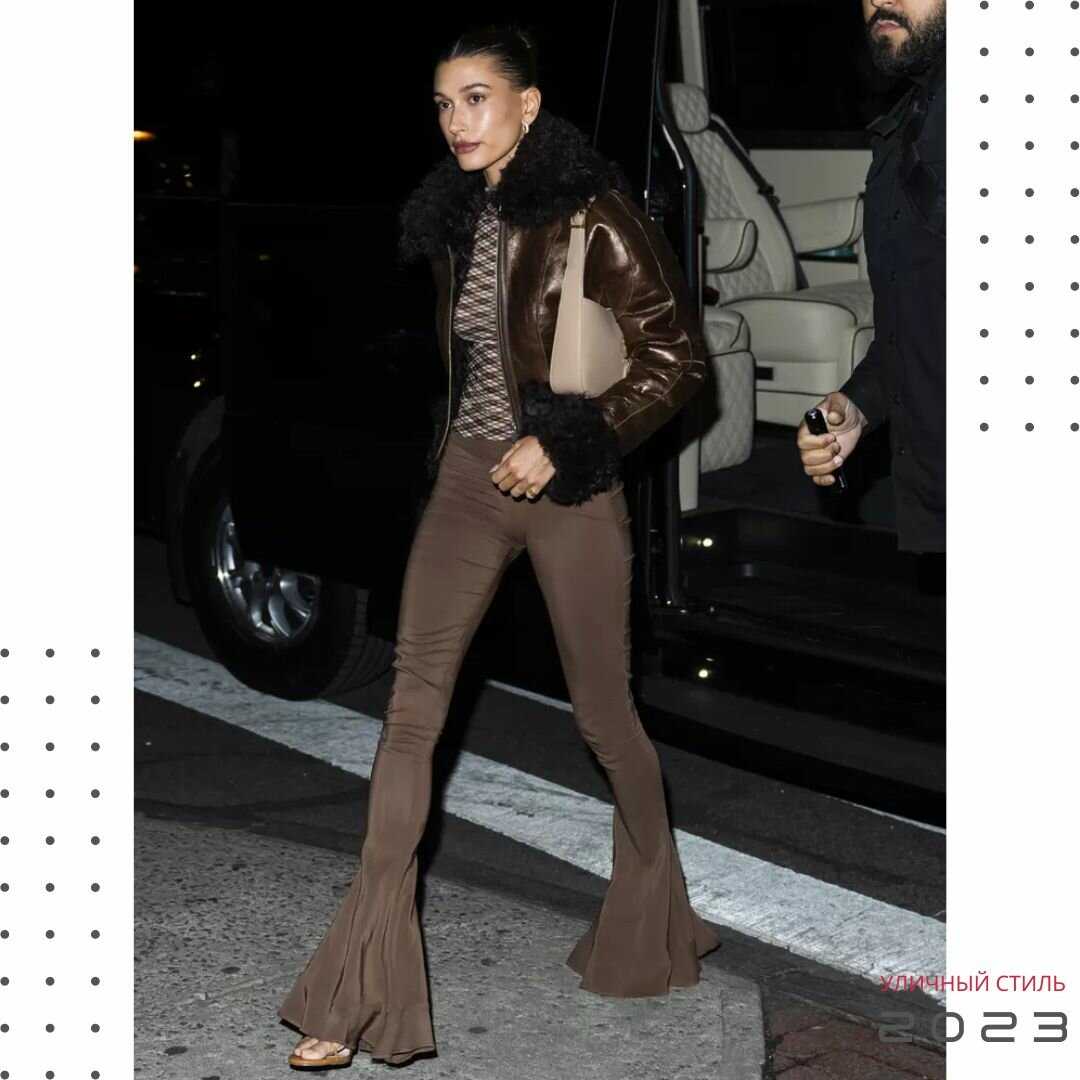 Образ, представленный на фотографии выше, является одним из моих любимых. Выйдя на ночную прогулку в Сохо, Бибер выбрала шоколадно-коричневую цветовую гамму. Правда, наряд не является традиционным сочетающимся комплектом, но все гармонично подобрано, от кожаной куртки до топа в клетку и расклешенных брюк.