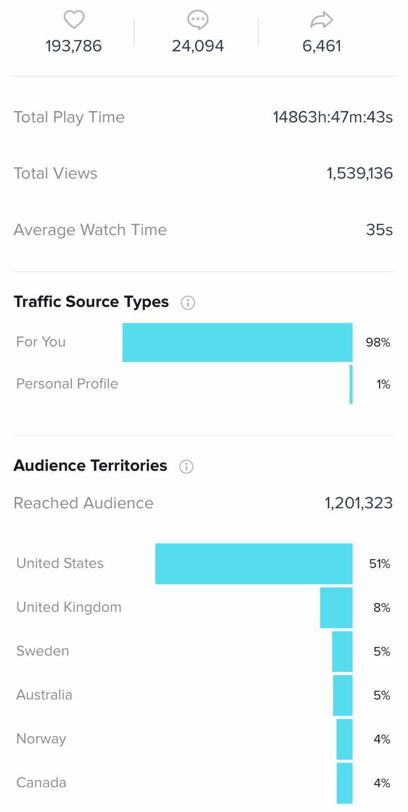 Платформа измеряет процент просмотра вашего видео, которое смотрит эта начальная группа, а также количество лайков, комментариев, репостов, которые получает видео. Одна деталь, которую я заметил из своего личного опыта — видео будет продолжать расти в статистике, если у него наблюдается 1/10 (1 лайк для каждых 10 просмотров). По анализу моих видео, контент, который получает меньше 1/10 перестанет расти, примерно 1/10 будет расти медленно, а затем, если вы можете поддерживать больше, чем 1/10 контент будет интенсивнее заходить аудитории..