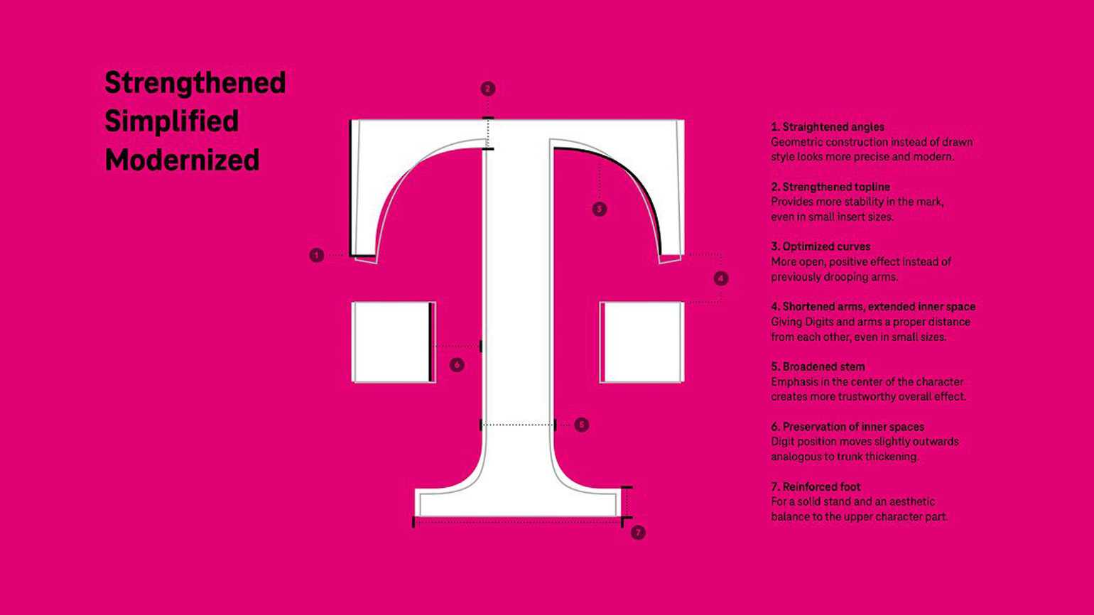 В 2020 году, в преддверии слияния с другой крупной телекоммуникационной компанией, Sprint, дизайн упростили и сделали компактнее, убрав из него почти все точки. Но это был лишь промежуточный этап. В феврале этого года «сокращённая» версия логотипа, состоящая из одной Т, стала основной. Причём она также претерпела изменения. Разработкой обновлённого начертания занималась студия MetaDesign из Дюссельдорфа. Оттенок логотипа стал чуть темнее ― New Magenta (TMO-040122). Но компания по-прежнему не планирует становиться «серьёзнее» и переходить к традиционной колористике для телекома: «Маджента ― не просто цвет. Этот оттенок выполняет для нас очень чёткую задачу».