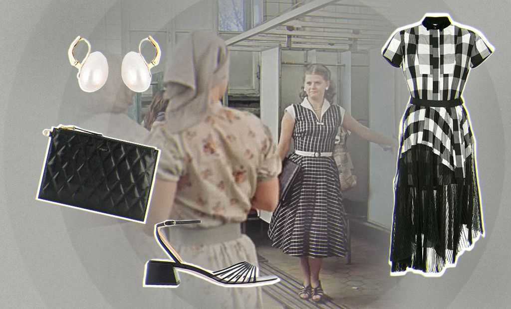 Платье в черно-белую полоску словно сошло с модного показа Dior – неудивительно, почему после фильма многие девушки ринулись в ателье с просьбой пошить точно такое же. Еще один модный лайфхак, который непременно стоит перенять у главной героини, – Людмила всегда правильно расставляла акценты в образах с помощью обуви, сумочек и ярких аксессуаров.
