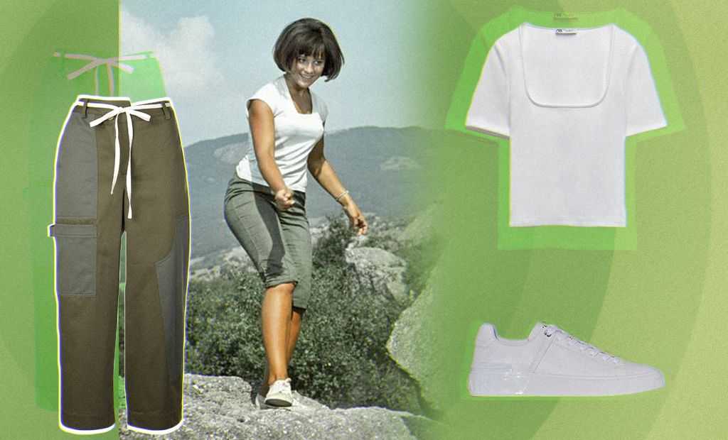 Брюки капри насыщенного зеленого оттенка станут идеальными спутниками на пикнике или отдыхе за городом. Несколько лет назад в моду вернулись велосипедки (помните, как мы смеялись над Ким Кардашьян, которая одной из первых рискнула их надеть?). А летом 2020 все вдруг стали носить удлиненные шорты бермуды, поэтому брюки капри не нечто новое в моде, а модный come back. Кстати, многие девушки вдохновлялись не только стилем Нины, но и ее бьюти-образом: темное каре, яркие брови и натуральный румянец были популярны еще в 1960-х.