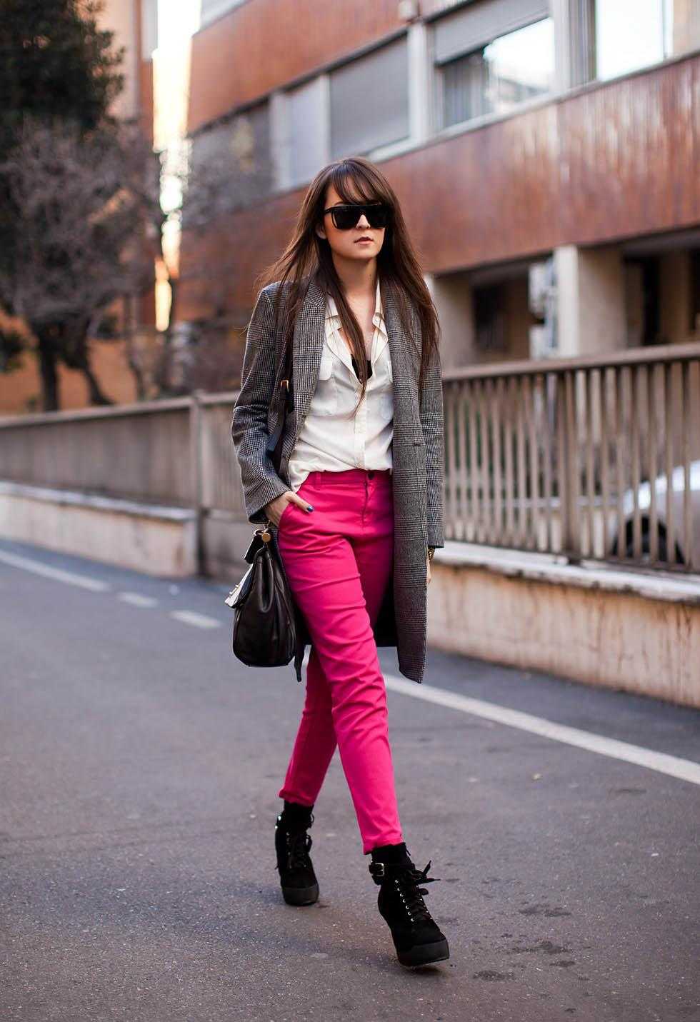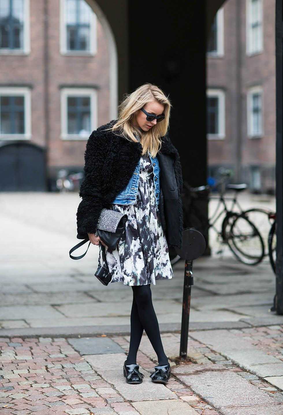 В повседневный стиль тоже можно вписать эту комбинацию, надев на платье пальто или объемную куртку. В таком случае платье должно быть строгого фасона или длиной до колена.