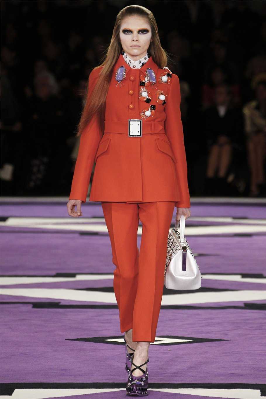 Коллекция Gucci удивительным образом сочетала в себе элементы разных стилей и эпох. На этом показе было все – фасон клеш, крупные кресты, легкие шифоновые платья в комплекте с ремнями, бархатные пиджаки и дерзкие платья длины мини. Стоит отдельно выделить яркие бархатные брюки с высокой посадкой и бальные платья в викторианском стиле.