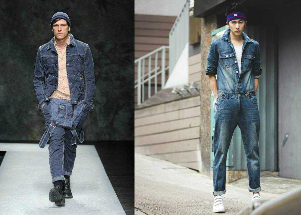 Декор выполняется в основном строчкой, в том числе контрастной, принтами (преимущественно черный рисунок), активно используются потертости и прорехи. Обилие карманов – еще одна отличительная черта мужских комбинезонов.Если верх открытый, то часто имеется один большой нагрудный карман на молнии или с клапаном на пуговице или несколько разных по размеру с зипперами.