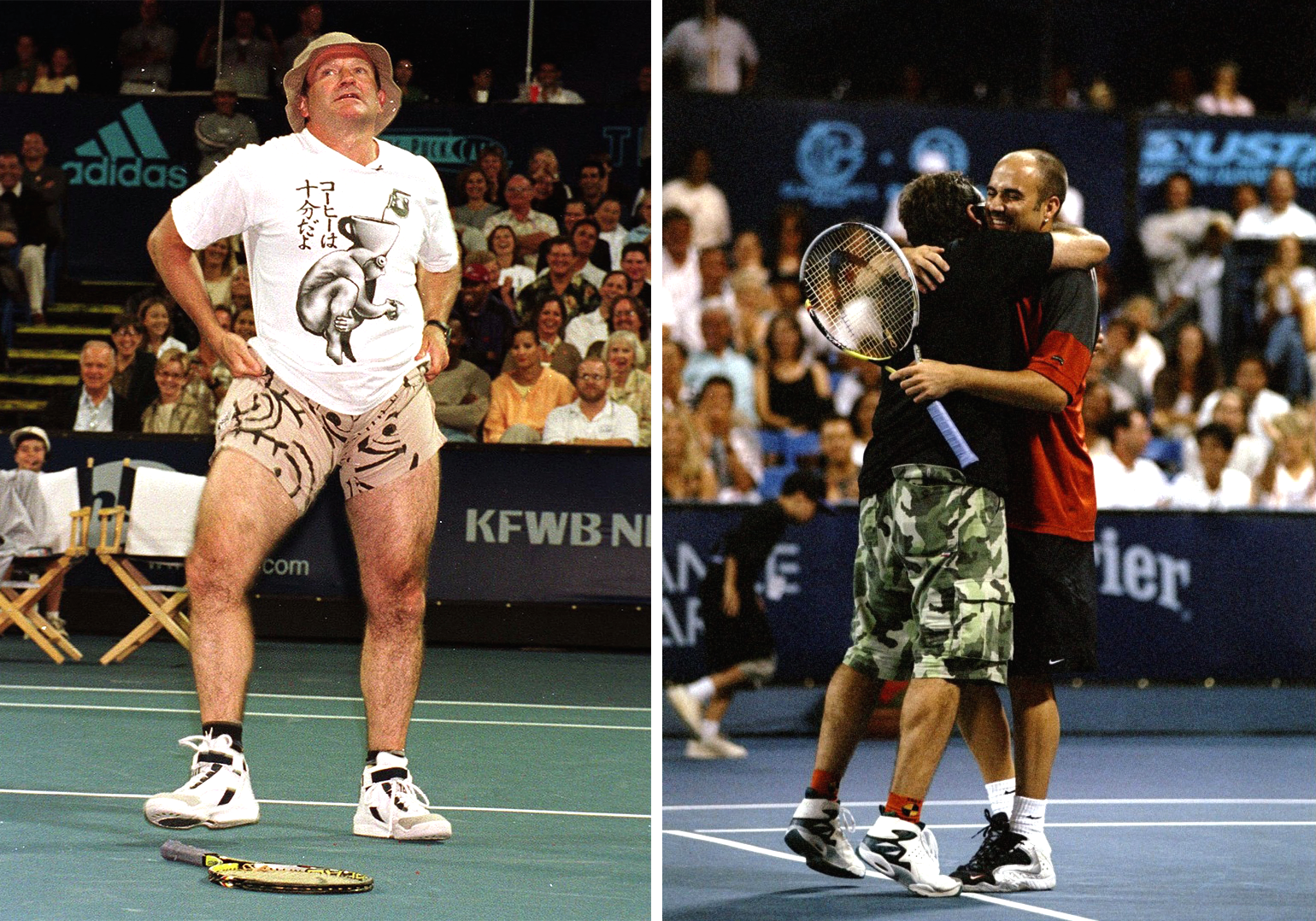 Робин Уильямс увлекся теннисом еще в колледже и продолжил заниматься этим видом спорта в перерывах между съемками. Образы, которые актер выбирал для своих игр, тоже были весьма стильными. Взять, к примеру, звездный матч Mercedes-Benz Cup 1999 года, на котором Робин играл в белой oversize-футболке с бежевыми шортами-карго и панамой Sean Diddy Combs того же оттенка, сочетающимися с минималистичными теннисными кроссовками и высокими черными носками. Или его появление на благотворительном матче «An Evening At The Net», куда он надел свободную футболку, камуфляжные шорты, белые кроссовки с зеленой подошвой и яркие носки.