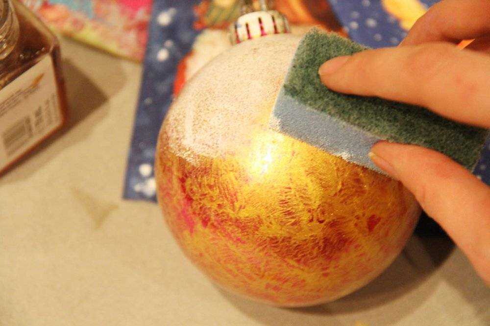 Помимо этого, необходимо подготовить белую акриловую краску, ей мы будем грунтовать шарик, клей ПВА, любая спиртосодержащая жидкость или ацетон для обезжиривания, акриловый лак, губка, кисточки разных размеров, цветные краски, блестки, бусины, бисер, ленты и другие элементы декора для украшения готового изделия. При создании декора также можно использовать различные техники и материалы – состаривание, нанесение декоративных потертостей и трещин, кракелюрный лак, создающий эффект растрескавшейся краски, текстурированные пасты и прочие способы, которые покажутся вам красивыми и уместными.