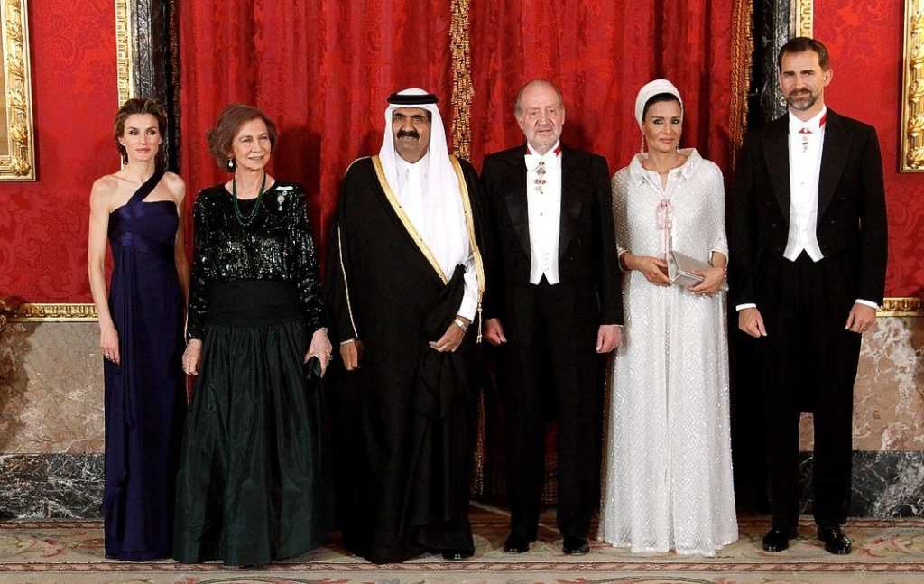 Принцесса Испании Летисия, королева Испании София, эмир Государства Катар шейх Хамад Бинт Халифа Аль-Тани, король Испании Хуан Карлос, шейха Моза бинт Насер аль-Мисснед и принц Испании Филипп на гала-ужине в честь шейха Хамада бин Халифа Аль-Тани в Мадриде, 25 апреля 2011 г.