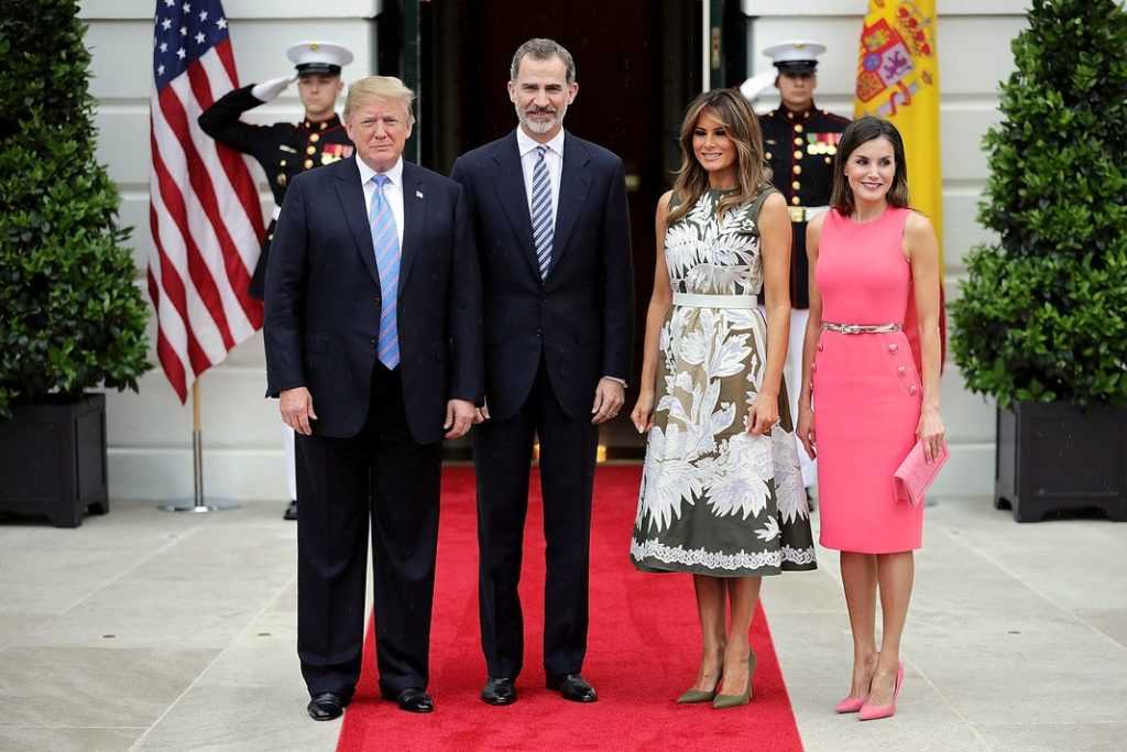 Президент Дональд Трамп, король Испании Филипп VI, первая леди США Мелания Трамп и королева Испании Летисия у Белого дома в Вашингтоне, 19 июня 2018 г.